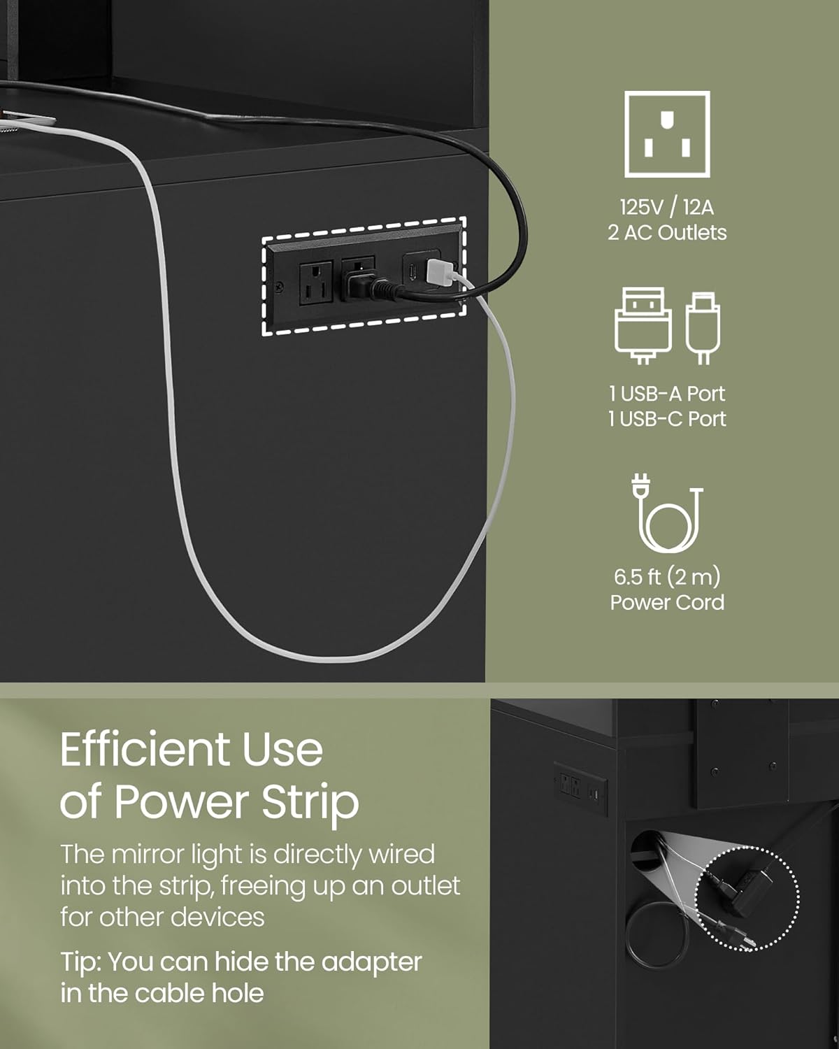 - 【CONVENIENT POWER HUB】The built-in power strip with 2 outlets, 1 USB-A, and 1 USB-C port conveniently powers your hair tools and charges your phone. The mirror's light is cleverly wired into the strip, freeing up an outlet for other appliances