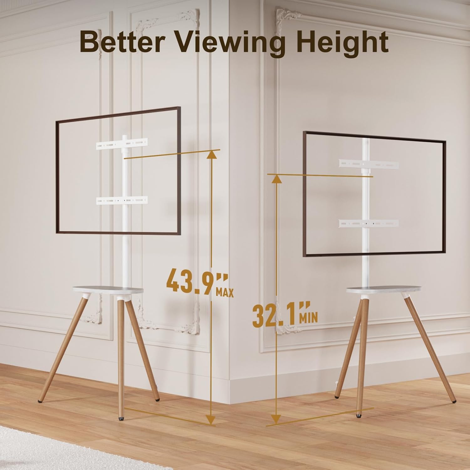 Tripod Easel TV Stand for 43-65" TVs, Height-Adjustable Swivel Corner Floor TV Stand with Wooden Tray, VESA 400x400 LCD/LED/OLED Compatible, Minimalist White