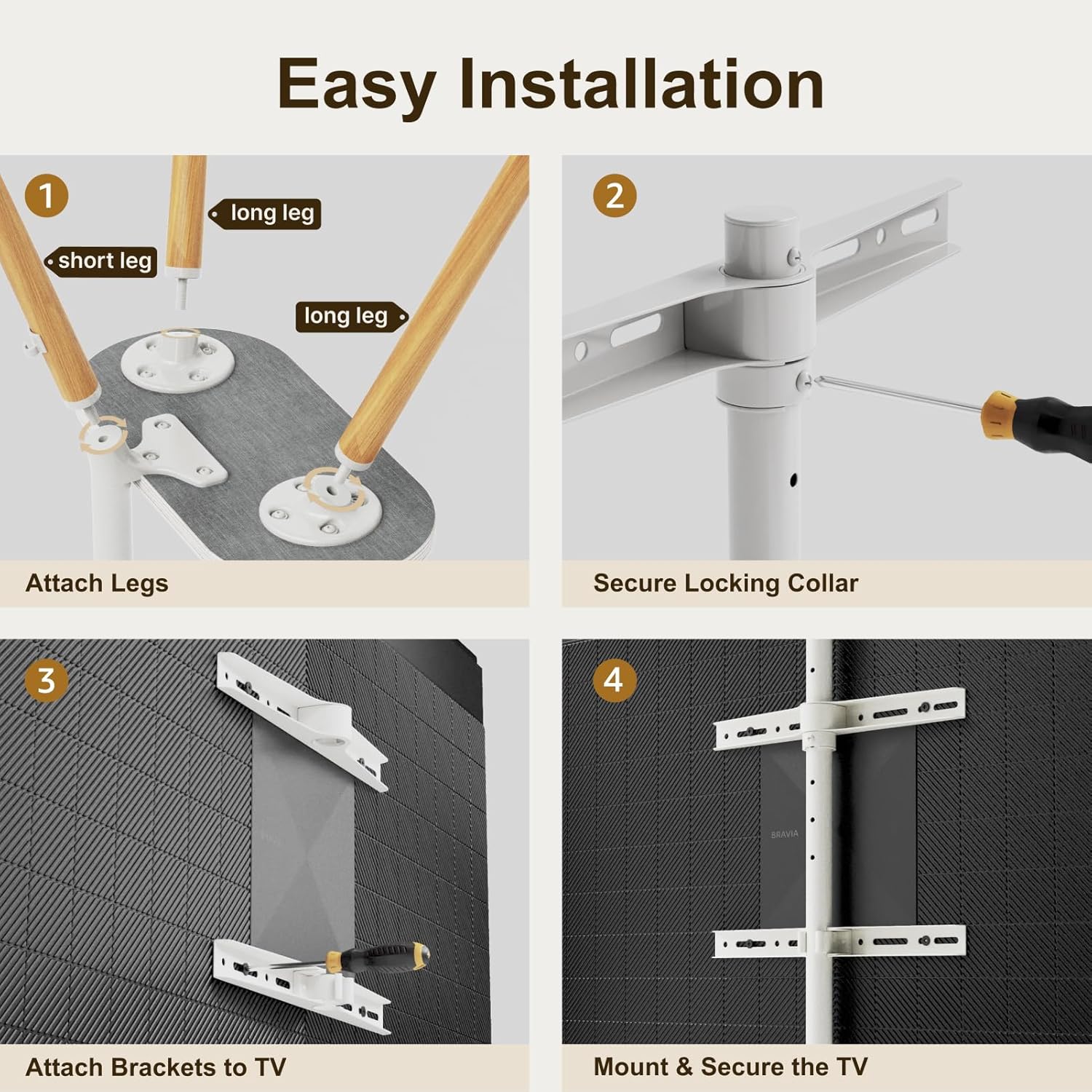 - 【Sturdy Materials with FSC-Certified Wood】This easel TV stand is constructed of high-quality metal and FSC-Certified wood, supporting up to 77 lbs (35 kg) of TV weight. It has passed rigorous UL/TUV laboratory testing at three times its rated load capacity. For added safety, an anti-tip pull cord is included to help protect your family and children. Despite its solid build, the stand remains easy to move from room to room.