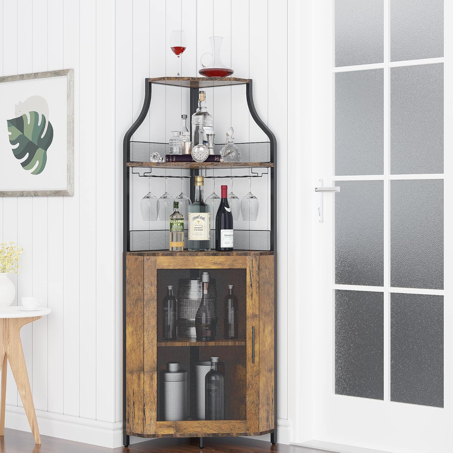 GAOMON Corner Wine Cabinet with Removable Wine Rack, Wine Bar Cabinet with Barn Door and Adjustable Shelves, Industrial Wine Cabinet for Dining Room, Living Room,Kitchen (Retro Brown)