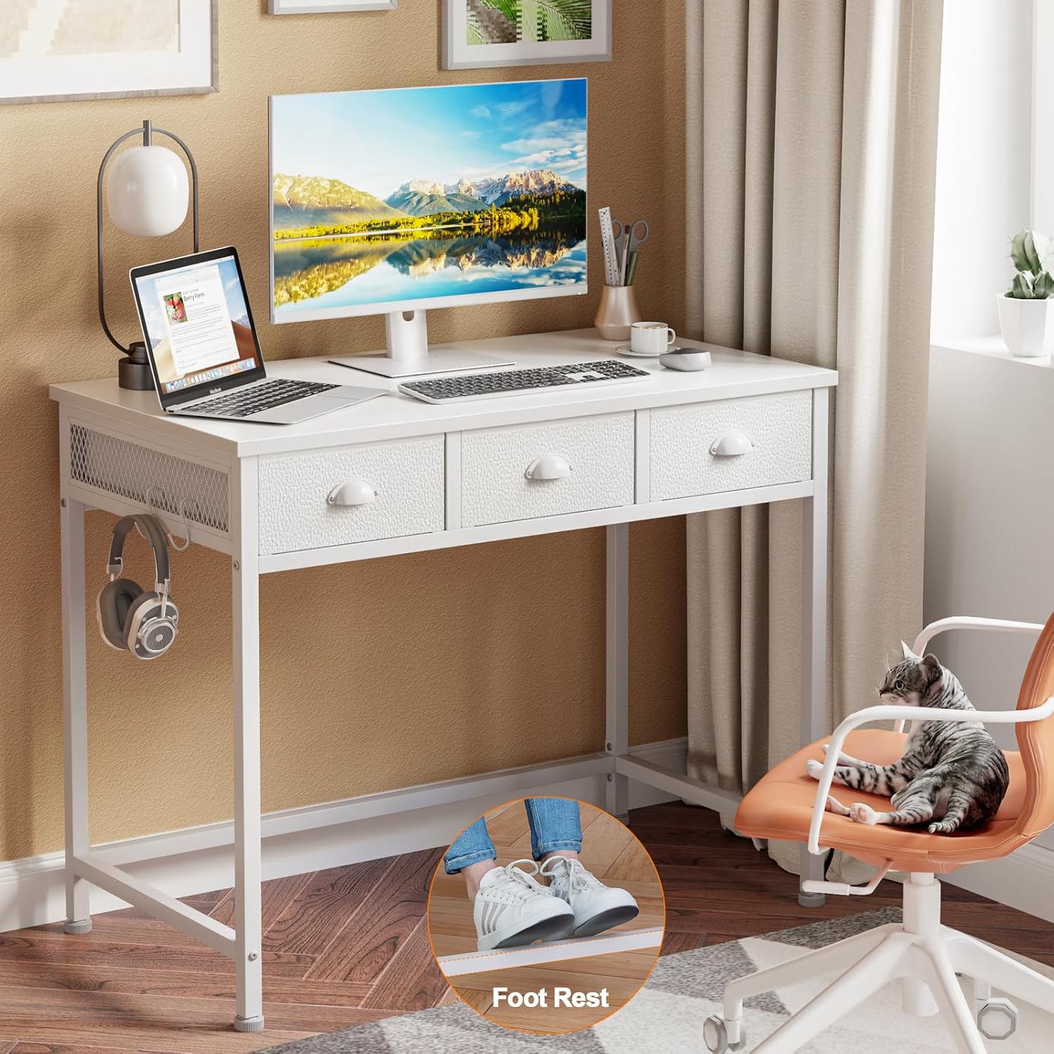 Furologee White Small Computer Desk with 3 Fabric Drawers,40 Inch Simple Table Home Office Writing,Vanity Desk with Hooks, Study Desk for Bedroom Small Spaces