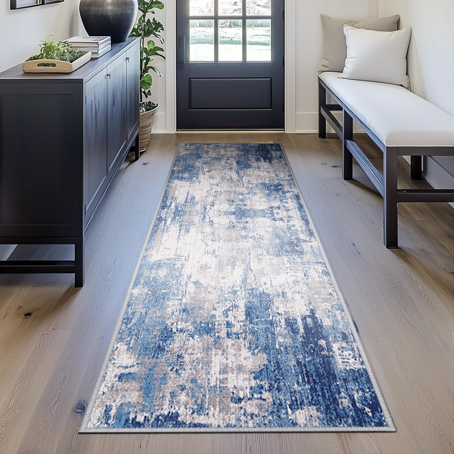 Washable Area Rugs 2'x6' Non-Slip Modern Abstract Soft for Living Room Entryway Bedroom Nursery, Print Pattern, Blue Grey Navy Gray