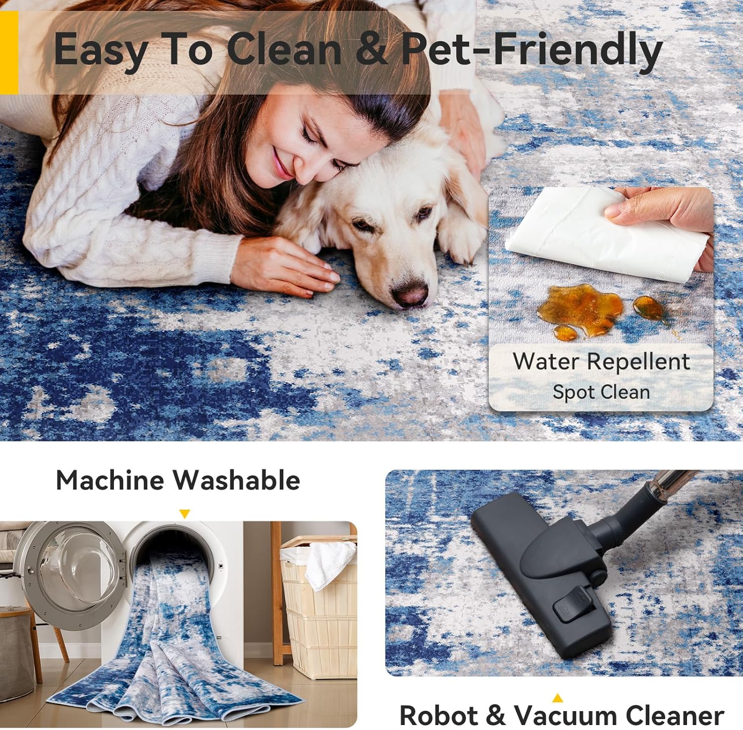 - Tides Series – Effortless style that flows with your life.This modern machine-washable non-slip rug features reinforced edges and a low-pile design that resists dirt. Its water-repellent surface makes spills easy to clean - liquids bead up for quick wiping. Simply machine wash in cold water (no bleach) to refresh. The non-slip backing keeps it securely in place. A perfect blend of function and contemporary design for active homes.
