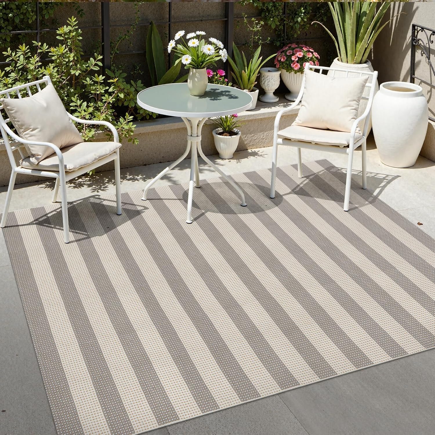 OJIA Outdoor Rug 5'x7' Striped Patio Rug Washable Indoor Outdoor Carpet Cotton Woven Outside Farmhouse Enrtyway Rug Large Area Rugs for Living Room Bedroom Backyard (Gray/White/Tan)