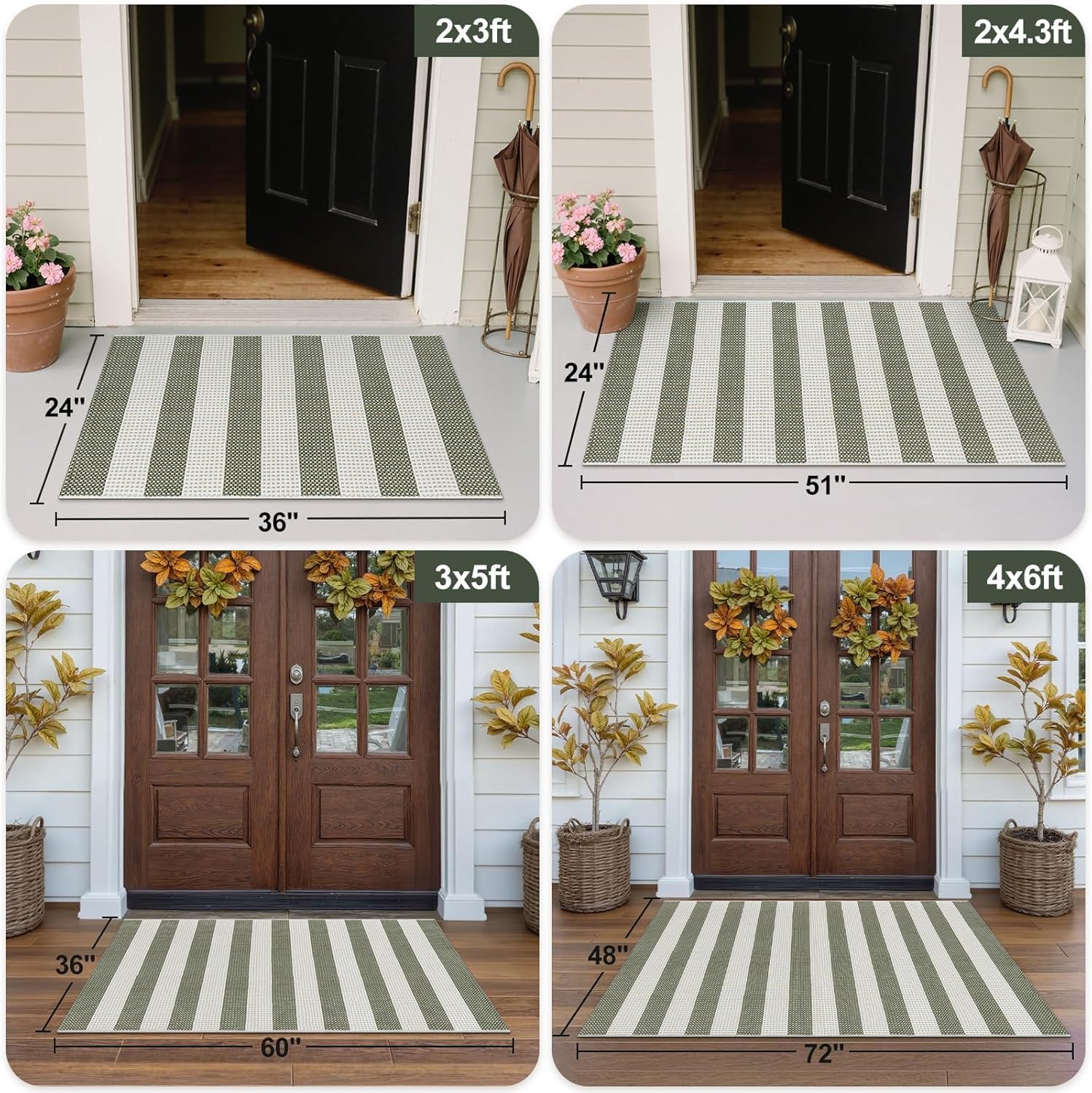 OJIA Striped Outdoor Area Rug 4'x6' Washable Patio Rugs Cotton Woven Living Room Rug Farmhouse Indoor Outdoor Rugs Large Floor Carpet for Courtyard/Bedroom/Entryway (Green/White/Tan)
