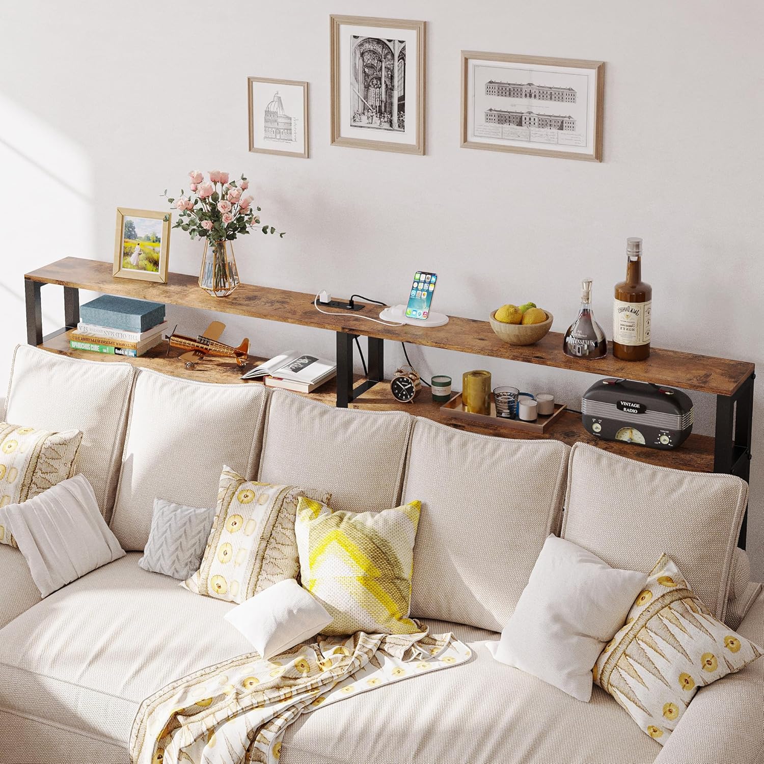 IRONCK Console Table with Power Outlet, Long Sofa Table with Shelves and X-Shaped Design, Narrow Sofa Entryway Behind Couch Table for Living Room and Hallway, Vintage Brown