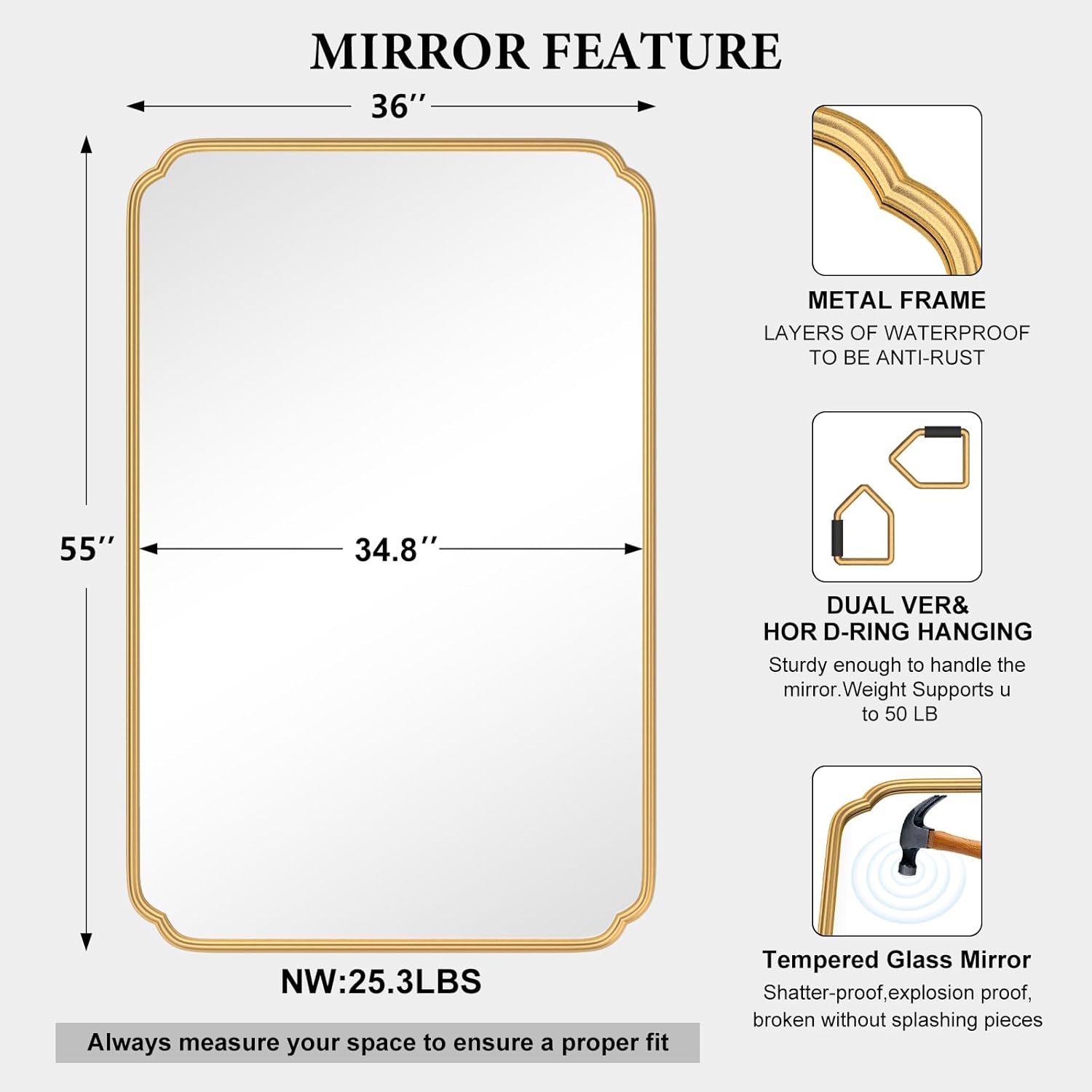 - 【36" x 55" Large Size】: 36" x 55" size is large enough for you to see entire figure. If you wish to add a bit of sophistication to your home, the gold wall mirror will not disappoint you. That will raise the level of decor.