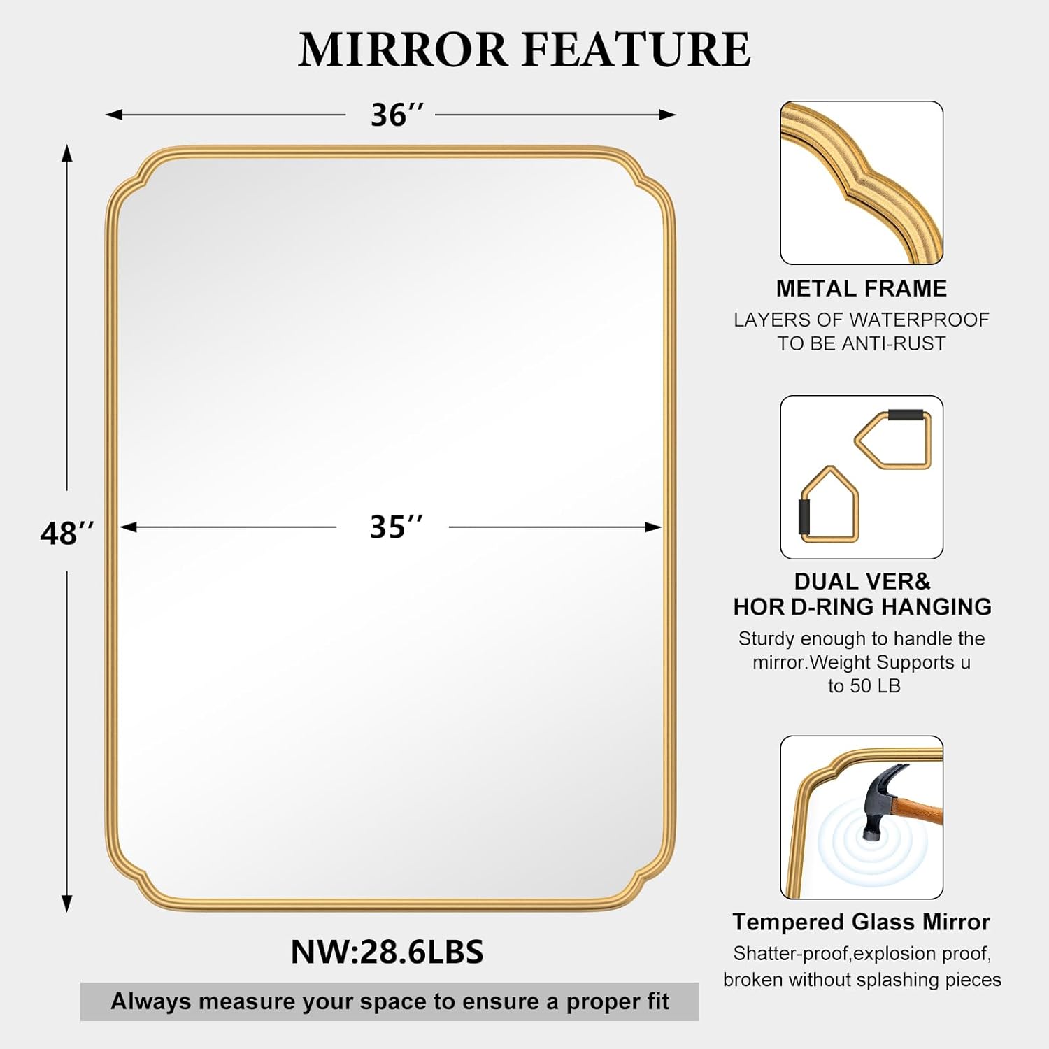 - 【36" x 48" Large Size】: 36" x 48" size is large enough for you to see entire figure. If you wish to add a bit of sophistication to your home, the gold wall mirror will not disappoint you. That will raise the level of decor.