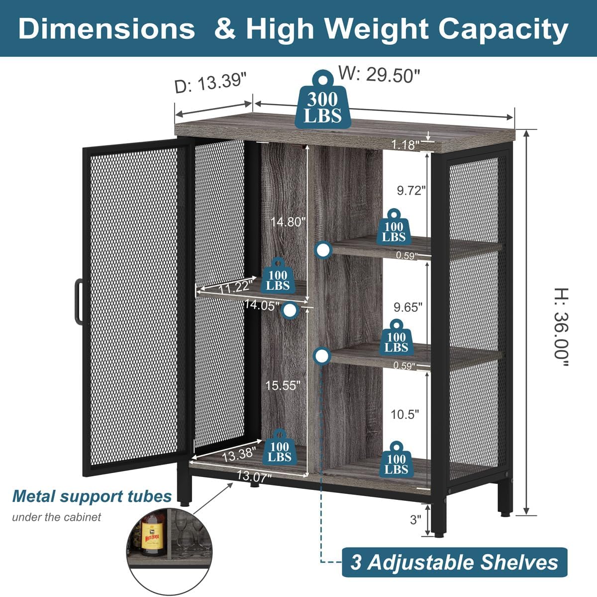 - Dimensions and Material: 29.50"W x 13.39"D x 36.00"H. Crafted with FSC-certified wood, our product supports sustainability and promotes responsible forest management. Crafted from high-quality MDF board with vintage oak wood grain finished that adds industrial touch to your home. We also use powder coating to seal up the steel and the metal of this accent cabinet wonβt rust over time.