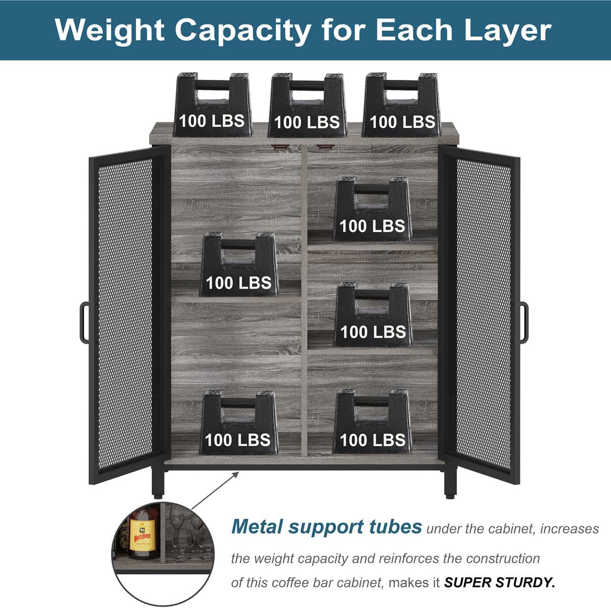 - Not Wobbles: Thanks to heavy duty metal frame and support tube under bottom shelf, the bar cabinet stands quit stable. We also provide anti-tip device, you can mount this coffee bar cart to the wall to avoid unexpected tipping. 4pcs pre-assembled plastic pads avoid your wood floor from scratching.