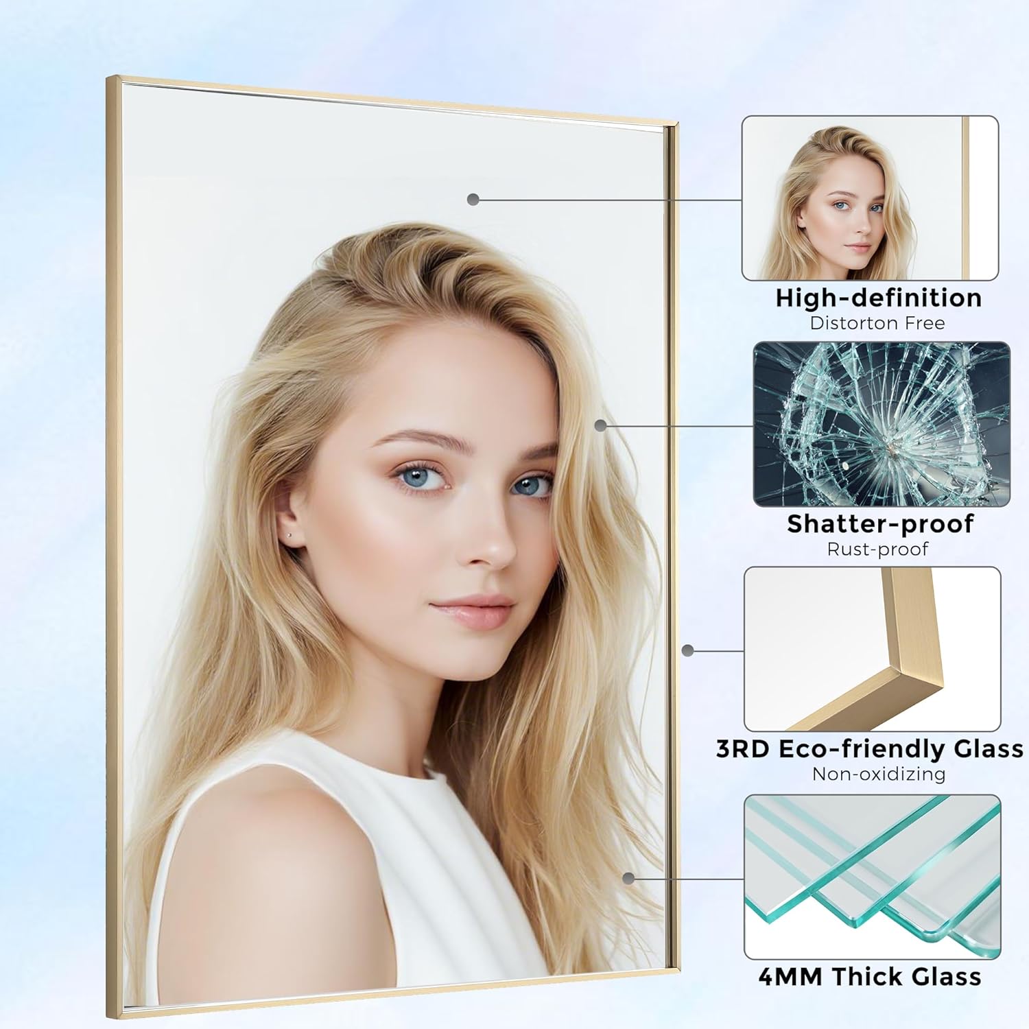- ❤️【Premium Material】- Made of premium aluminum alloy and imported mirror materials, the mirror is more durable than those made of wood or rubber. The mirror edge is protected by the Aluminum frame from hurt and ensure beauty.