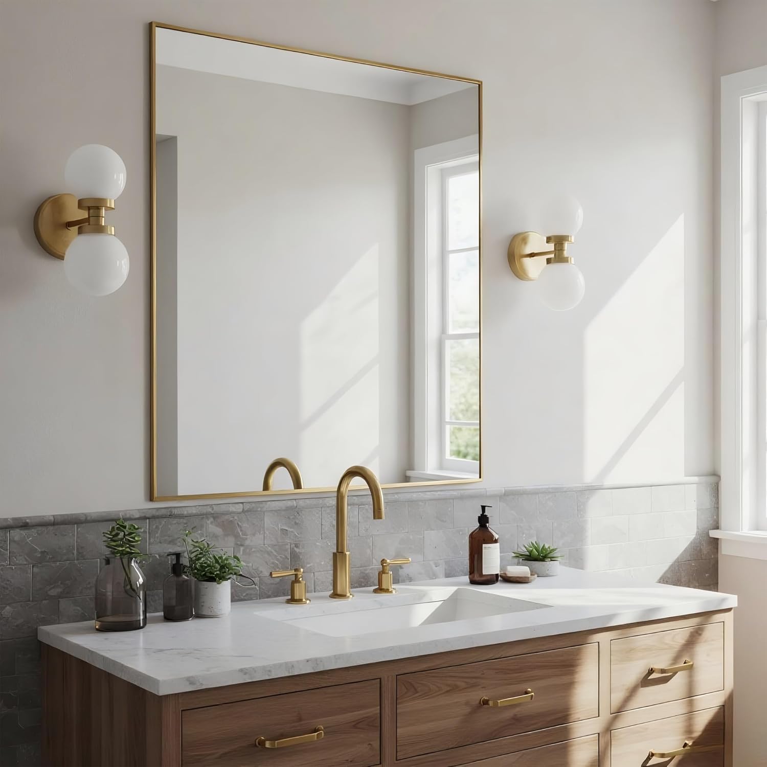 30x30 Inch Brass Bathroom Mirror for Wall, Aluminum Frame Rectangle Rectangular Vanity Mirror, Modern Large for Bedroom, Living Room, Horizontal or Vertical