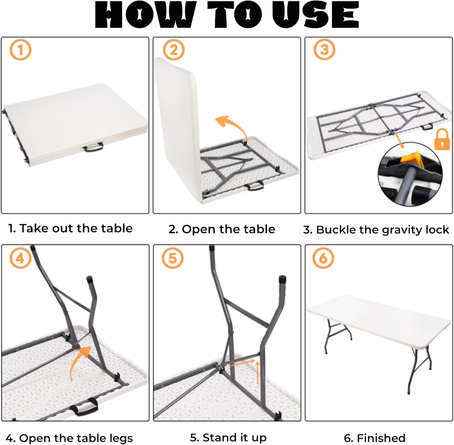 - Durable and Stable: Powder-coated steel round tubing legs with bracing design for extra strength and stability. Thanks to the honeycomb design, the pressure applied to the table top is dispersed, making the 6 foot folding table exhibit excellent load carrying capacity of up to 440 pounds.