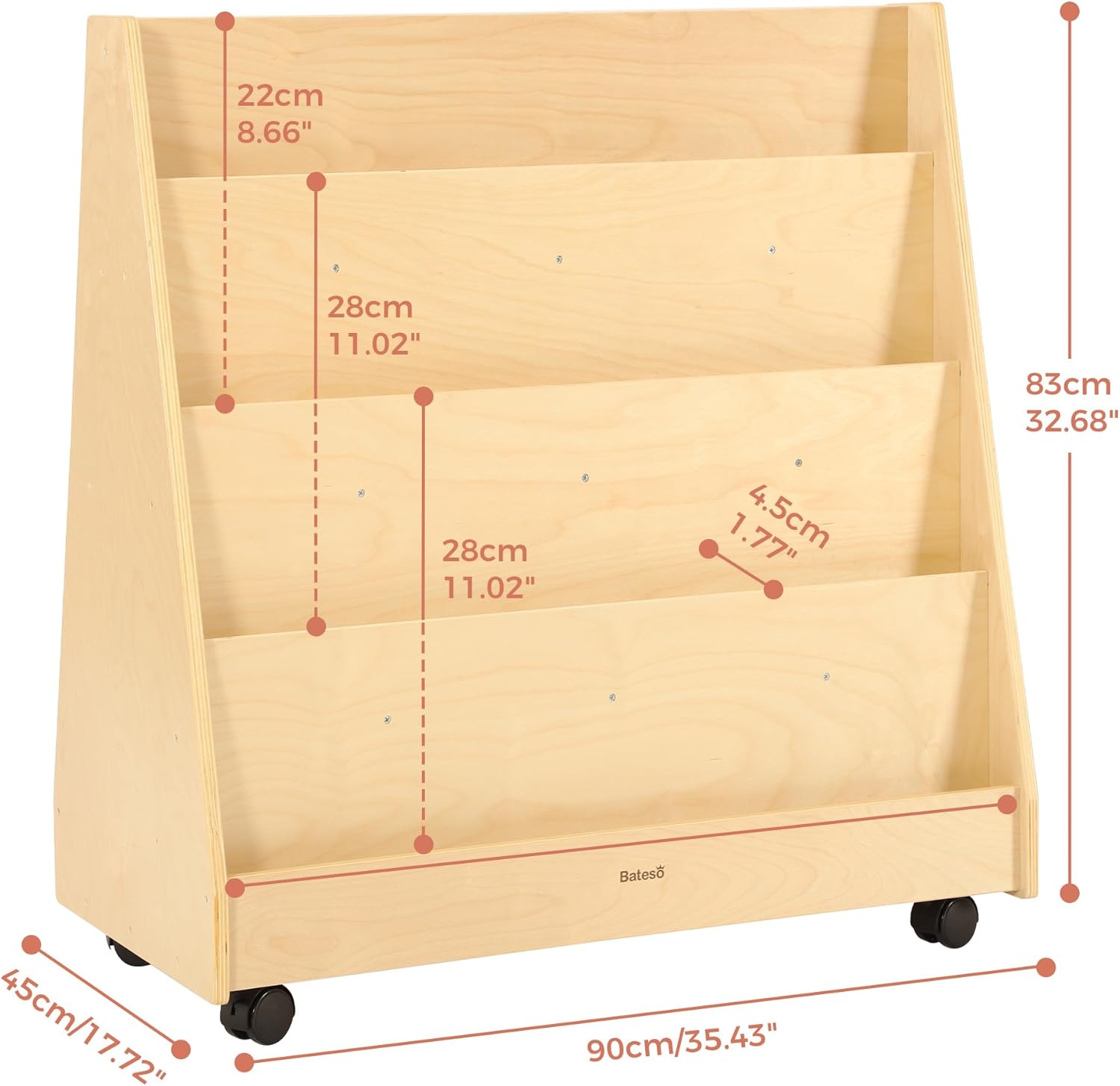 - DOUBLE-SIDED WITH WHEEL DESIGN: The double-sided design of our book rack offers twice the storage capacity, maximizing space utilization while allowing easy access to all of your child's favorite books from any angle. The bookshelf for kids is equipped with lockable wheels. It can be easily moved from one room to another and easily fixed in position