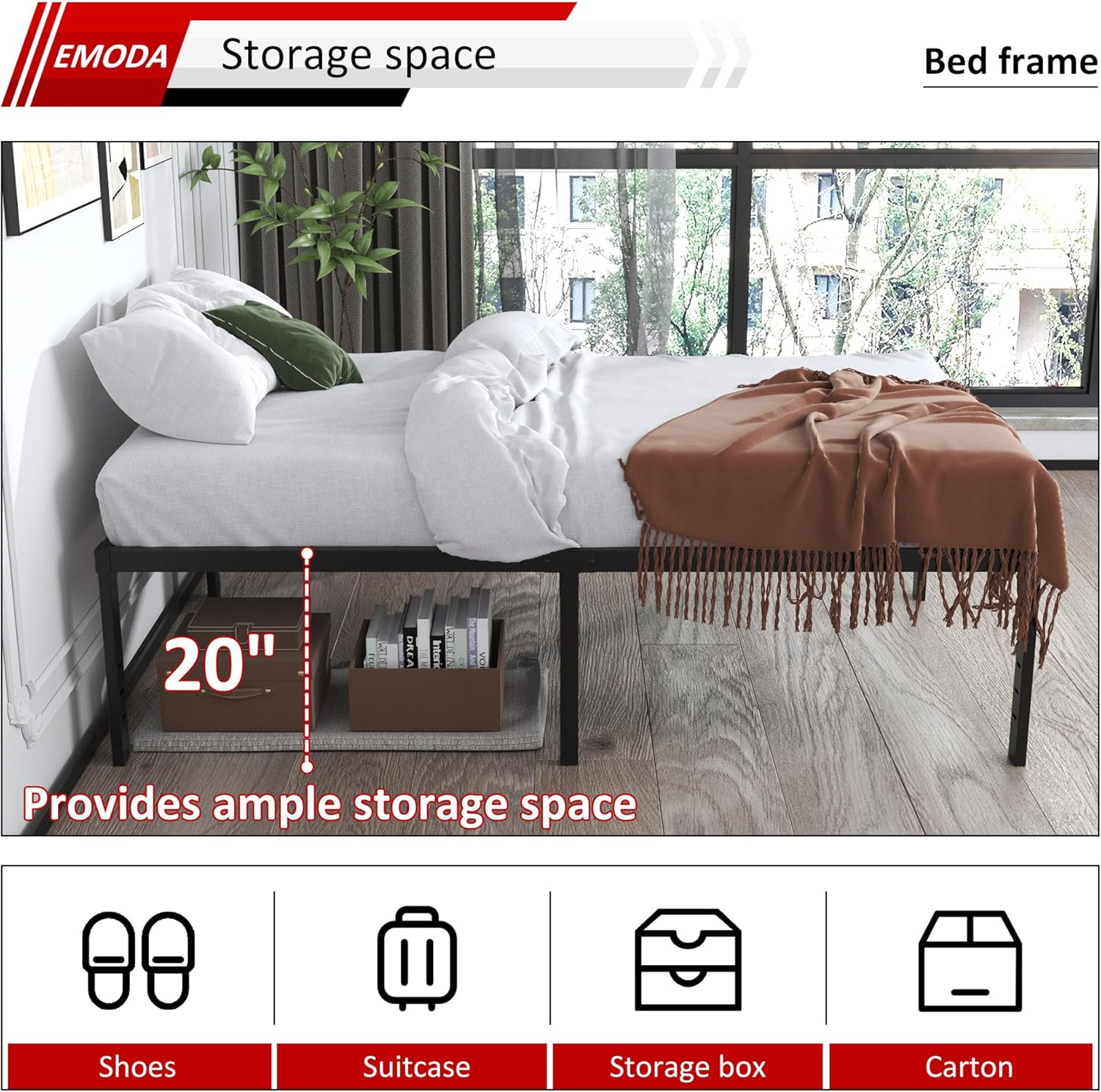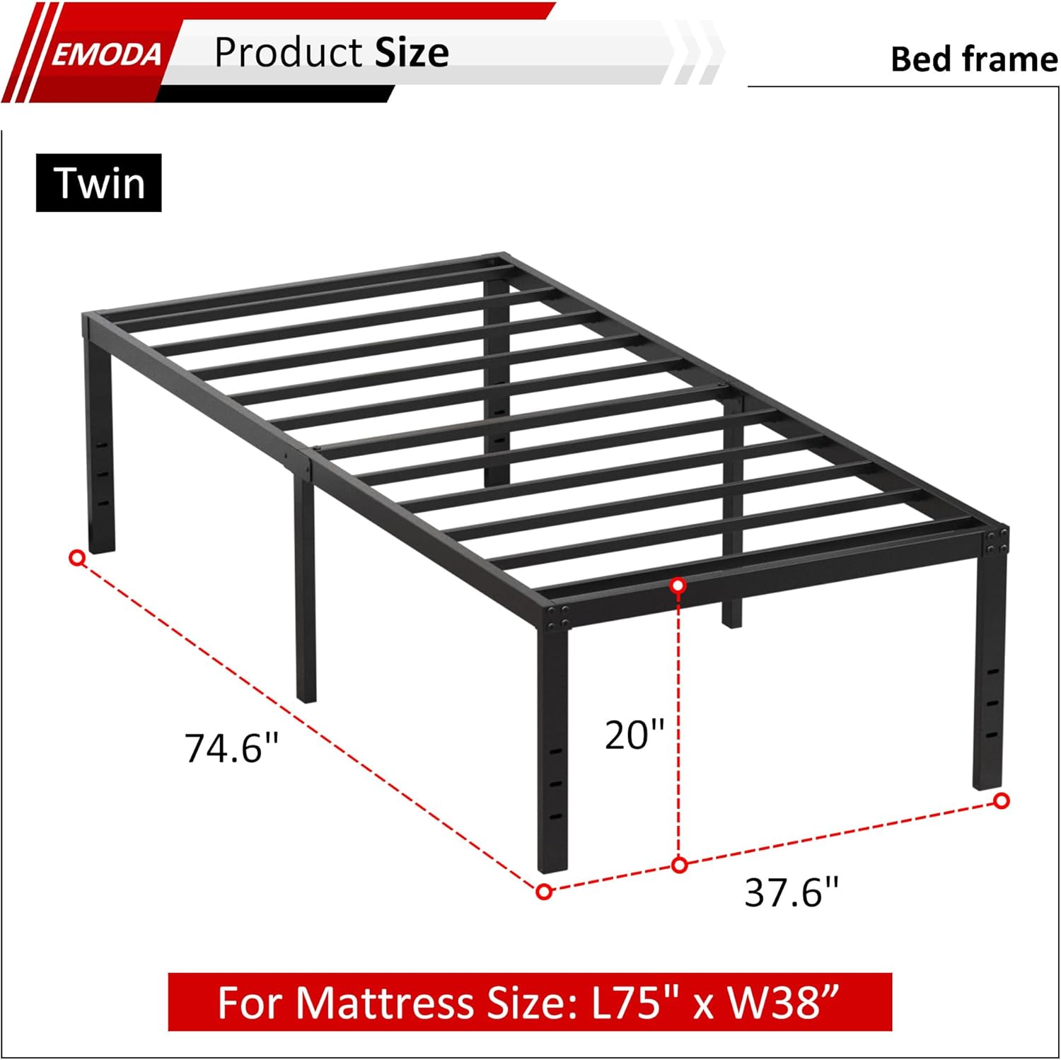 EMODA 20 Inch Twin Bed Frame No Box Spring Needed, Heavy Duty Tall Metal Twin Platform Bed Frames with Large Storage Space, Noise Free, Easy Assembly, Black