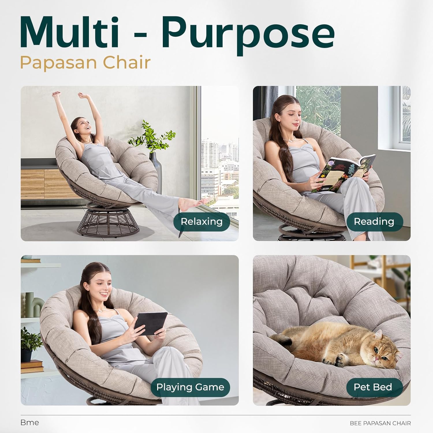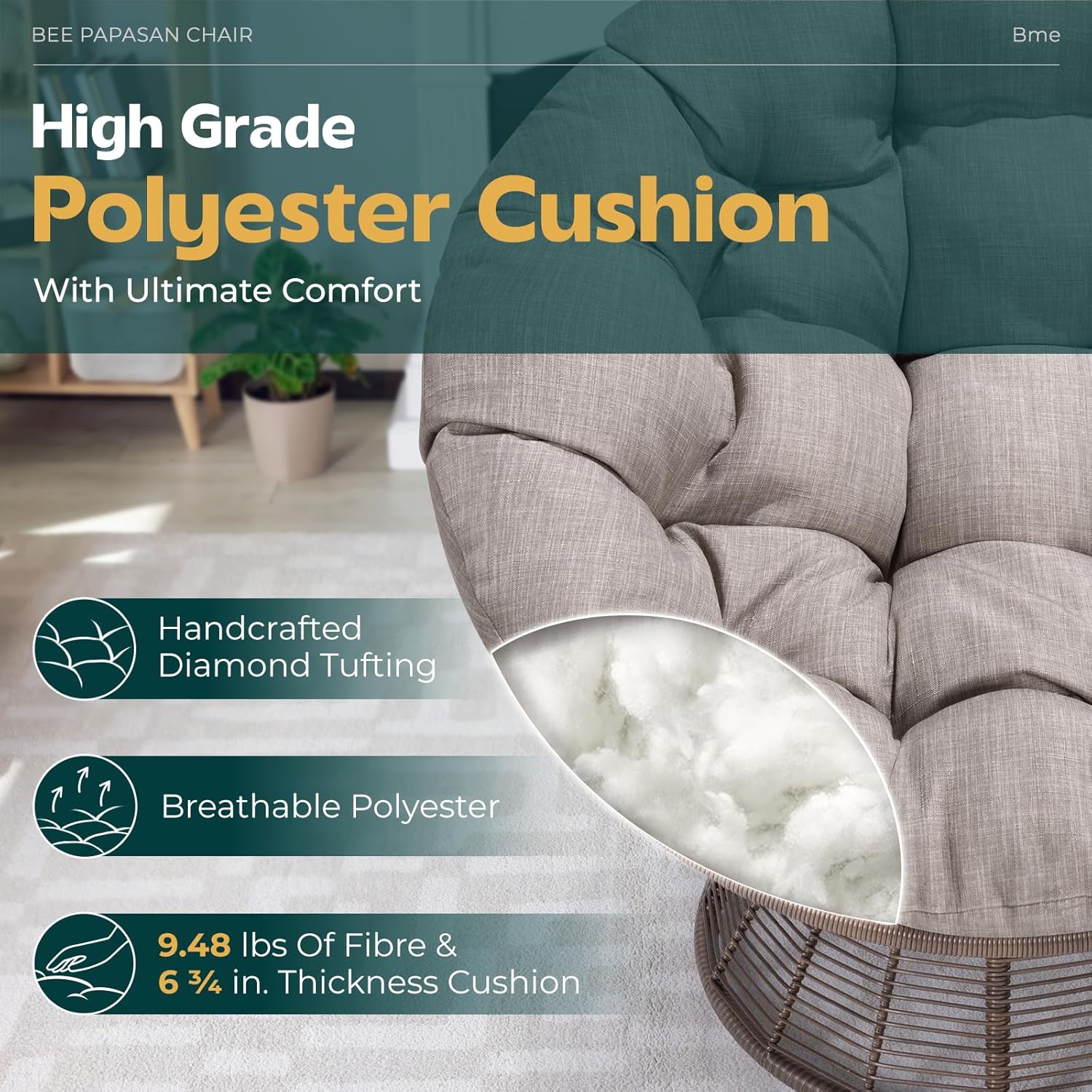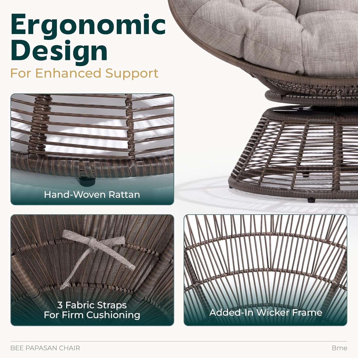 Bme 40" Ergonomic Wicker Papasan Chair with Soft Thick Density Fabric Cushion, Bee-Designed Base, High Capacity Steel Frame, 360 Degree Swivel for Living, Bedroom, Reading Room,...