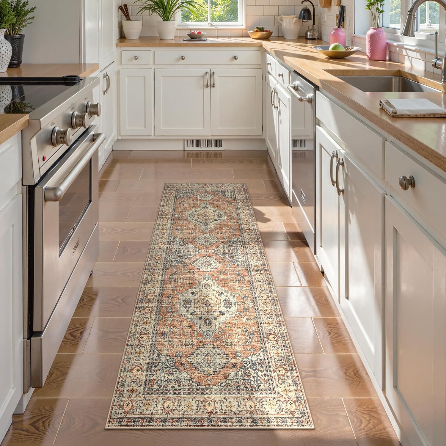 Lahome Oriental Washable Rug Runners for Hallways, 2x5 Kitchen Runner Rug Non Slip with Rubber Backing Ultra-Thin Vintage Carpet for Bedroom Bathroom, Peach/Orange