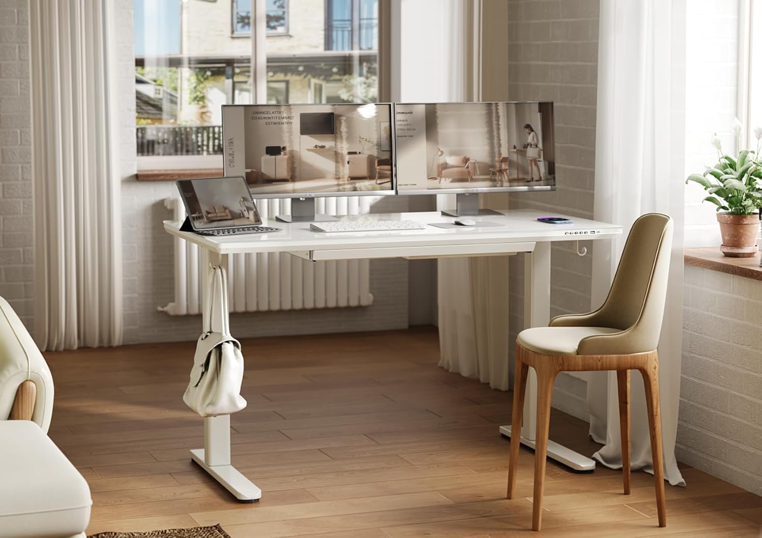 INNOVAR Wireless Charging Glass Standing Desk with Drawers, Adjustable Height Stand Up Desk, Electric Standing Desk with Storage, 55 inch, Super White