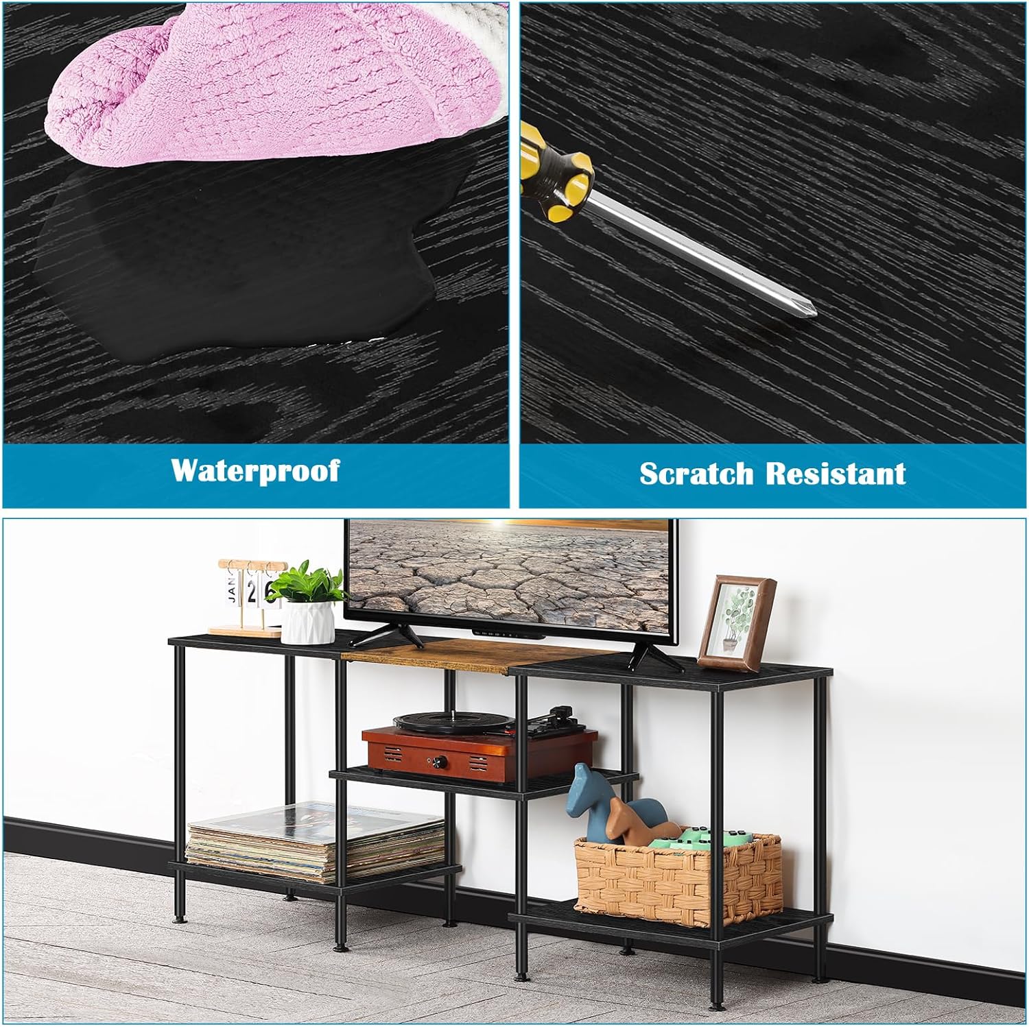 - Reliable & Sturdy: The sturdy metal frame ensures the overall stability and durability of the black TV stand, easily supporting the weight of the TV without wobbling, equipped with adjustable foot pads on the bottom, it will not be affected although your floor is uneven