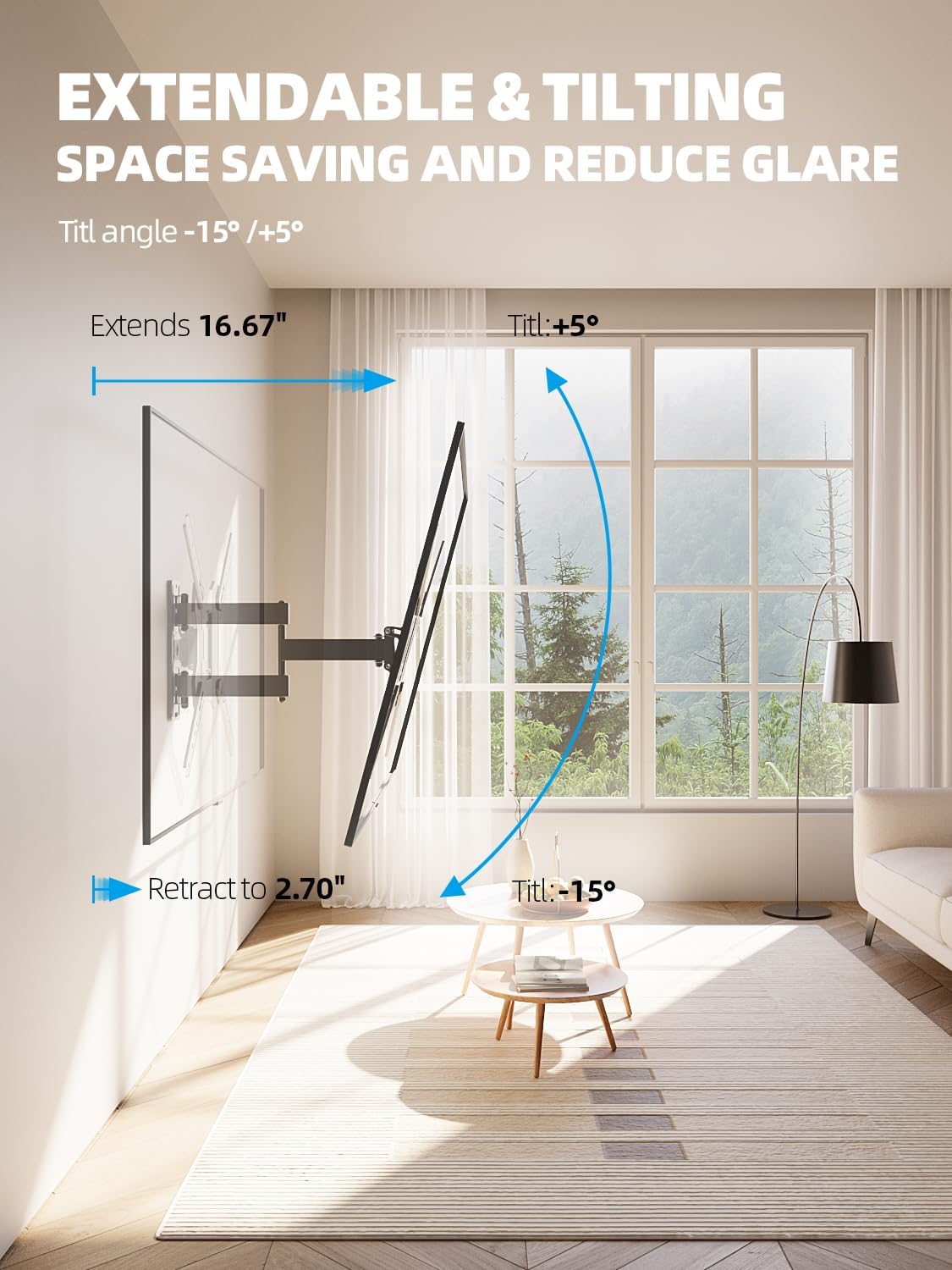 - 【Move to adjust Viewing Angle】 The wall mount TV bracket allows +/-90°swivel (max. swivel angle depends on TV size), perfect for corner. The extendable arm pulls out 16.7 in to bring your TV closer for more comfortable viewing, and retracts back to 2.7 in to save space. You can tilt angle ranging from +5°to -15°to help reduce glare and +/-3°level adjust to provide full-motion adjustment capacity for ideal viewing