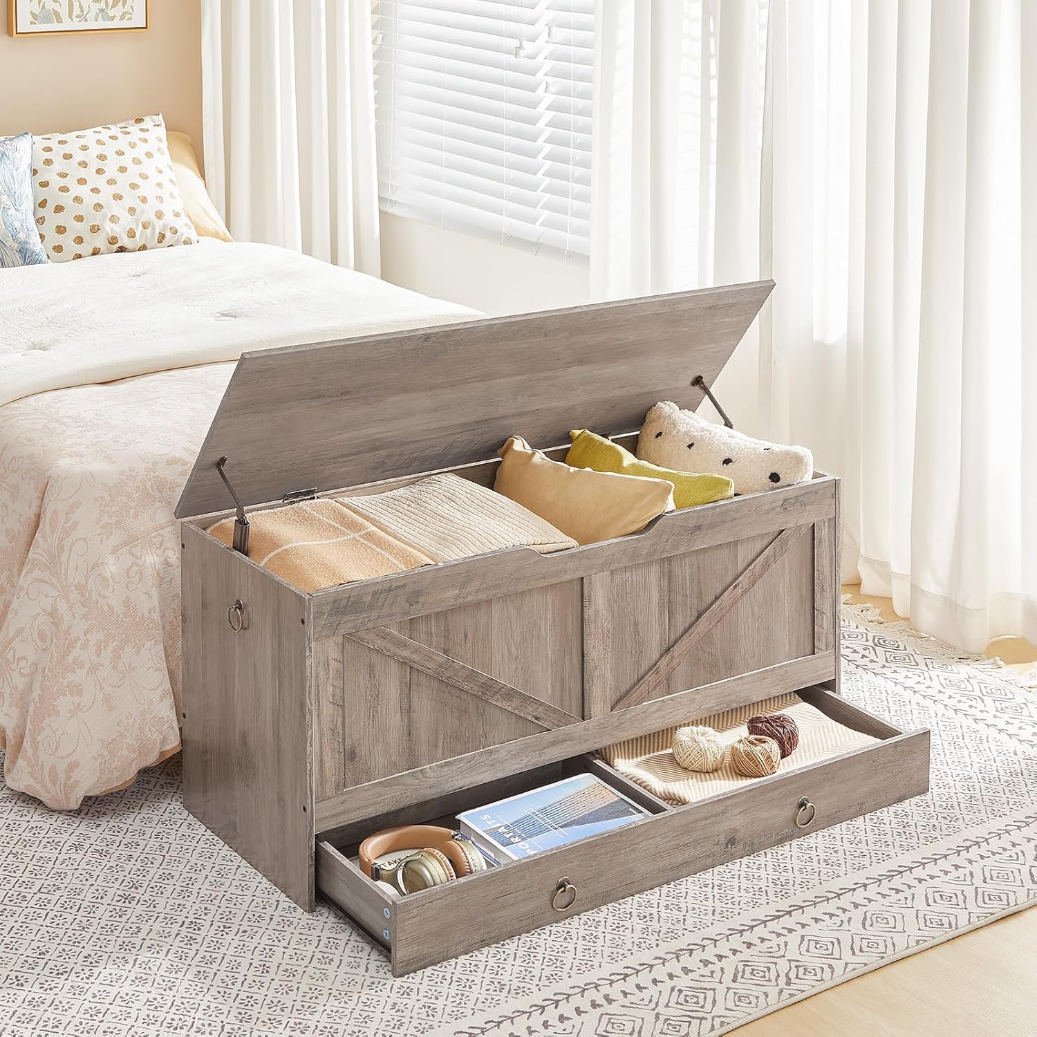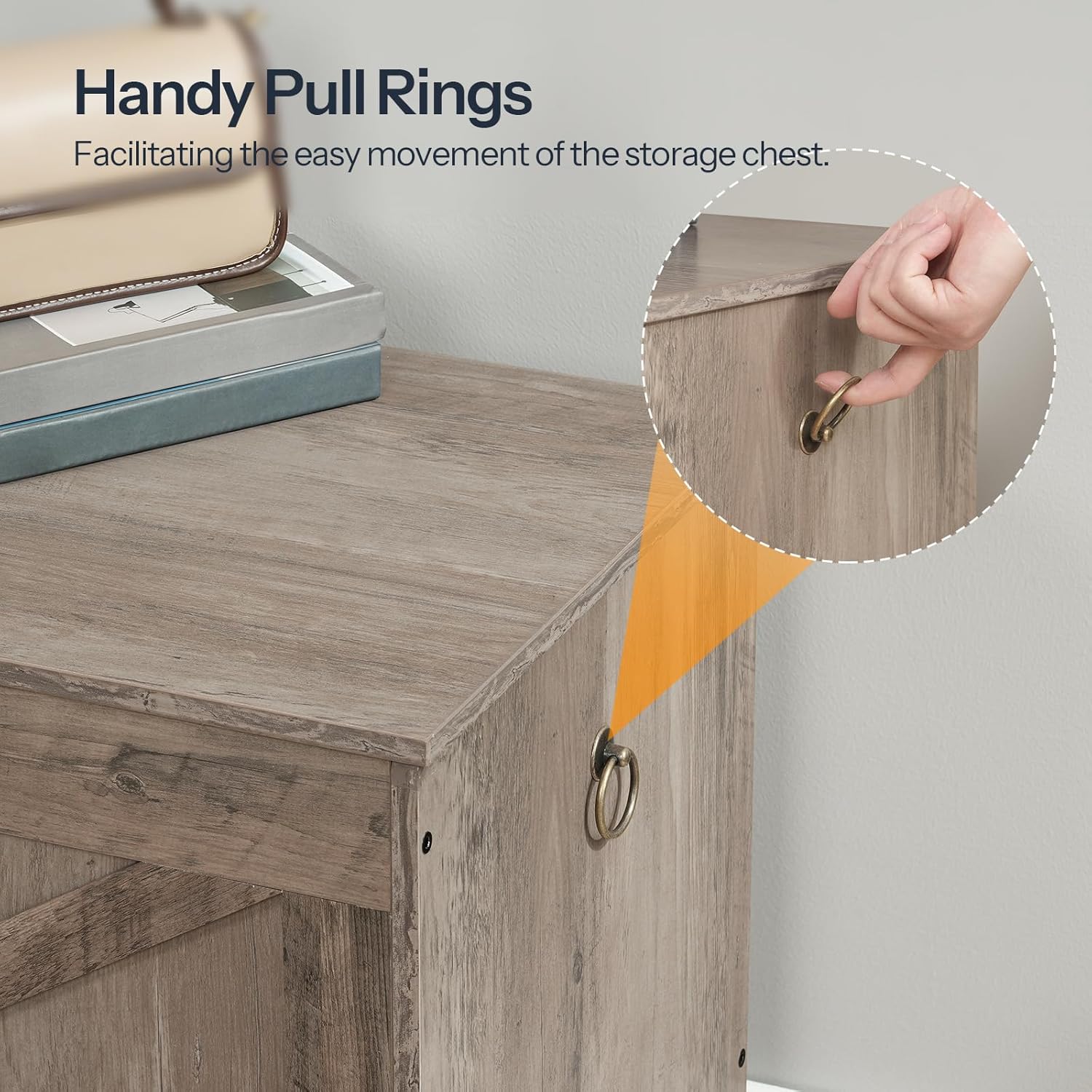 - Robust Materials, Multifunctional Roles: Storage bench made of high-quality particleboard features great sturdiness and durability. Two side handles are designed for easy movement. The rustic look with beauty makes this storage chest versatile anywhere