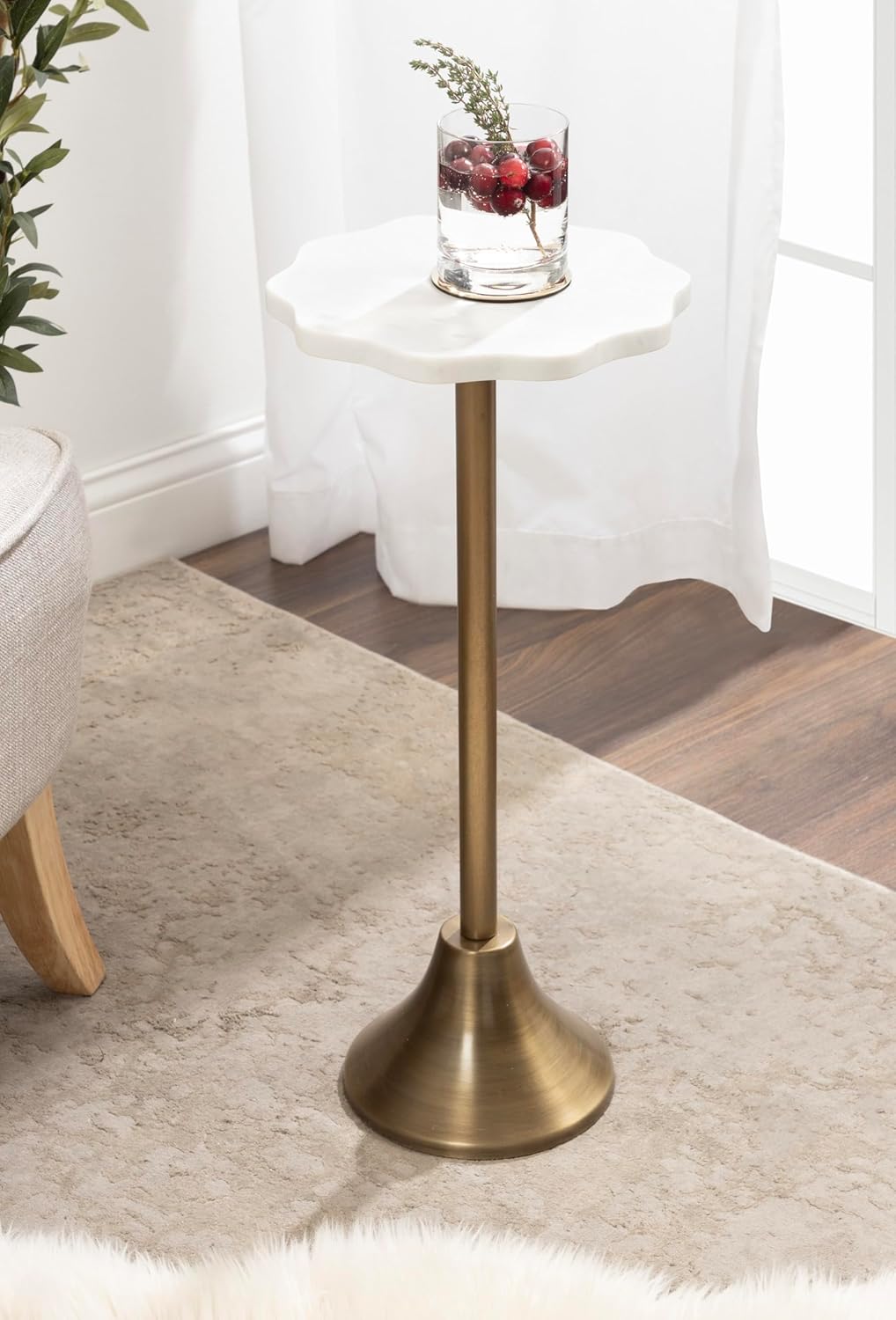 Kate and Laurel Sanzo Modern Pedestal Drink Table, 10 x 10 x 23, Antique Brass and White, Decorative End Table with Scalloped Marble Tabletop for Use as Small Plant Stand or Cute Martini Table