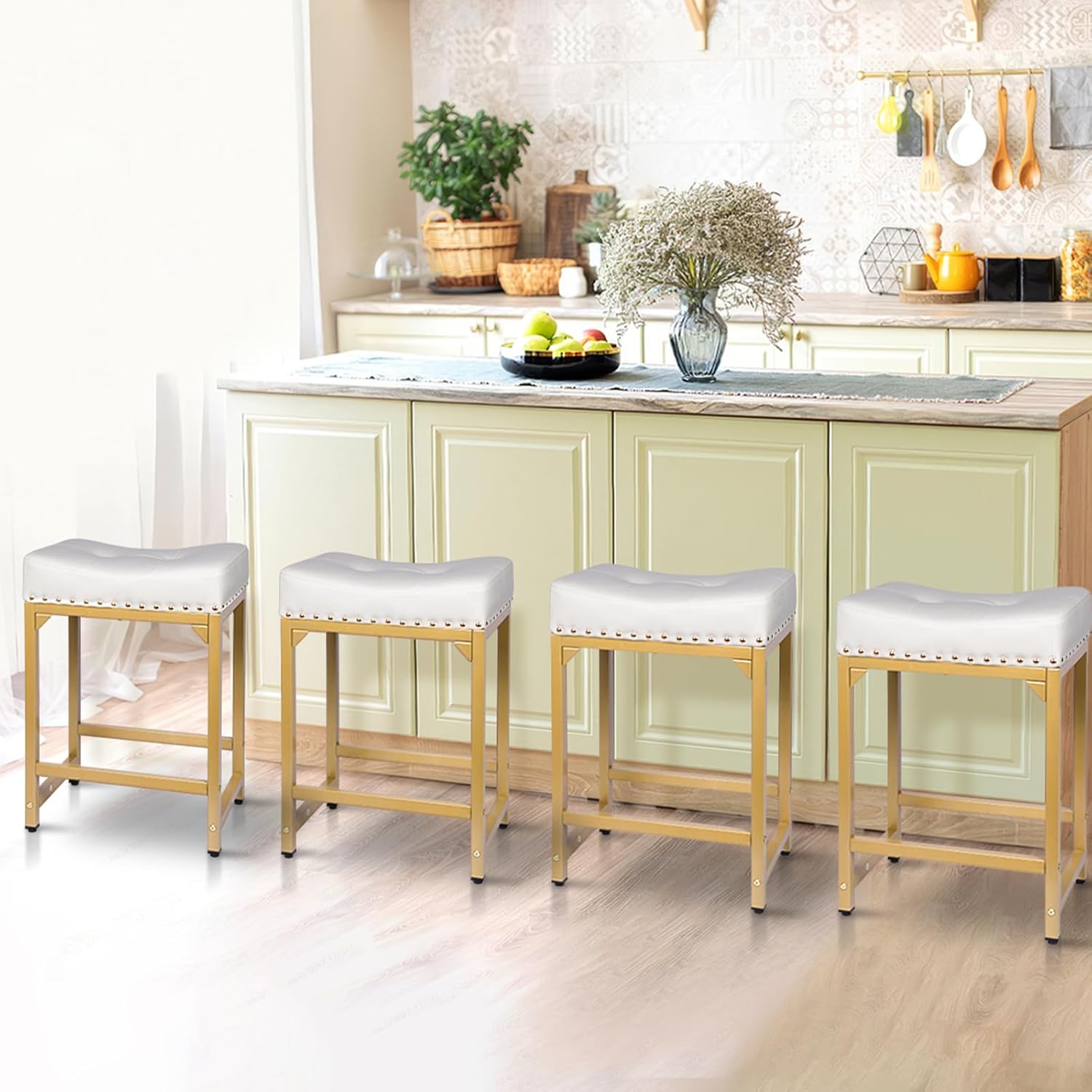 Bar Stools Set of 2, Counter Height Bar Stools for Kitchen Island, 24 Inch Modern White & Gold Saddle Backless Barstools, Counter Stool with Metal Base & Thick Saddle Seats(White+Gold)