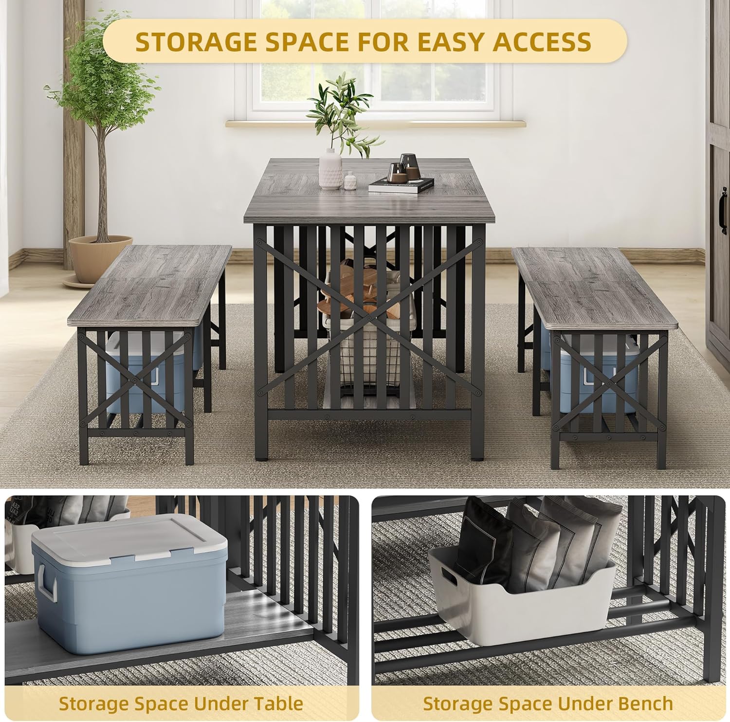 DWVO 3-Piece Dining Table Set for 4-6 People, 63" Dining Room Table with 2 Benches, Industrial Rectangular Dining Room Table Set with Storage for Kitchen, Dining Room, Grey