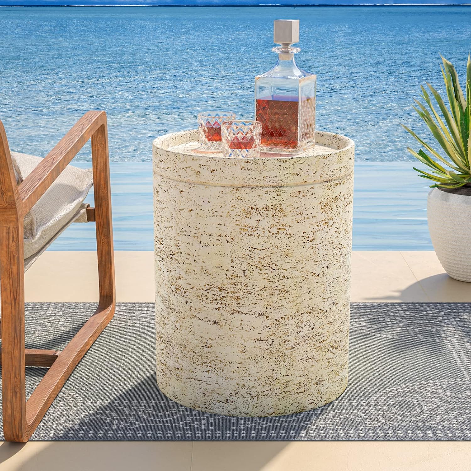 COSIEST 2 Pieces Outdoor Side Table, Set of 2 Cylinder Shaped MgO Patio End Table, Lightweight Accent Table with Tray Top, Round Plant Stand for Garden and Deck, Beige