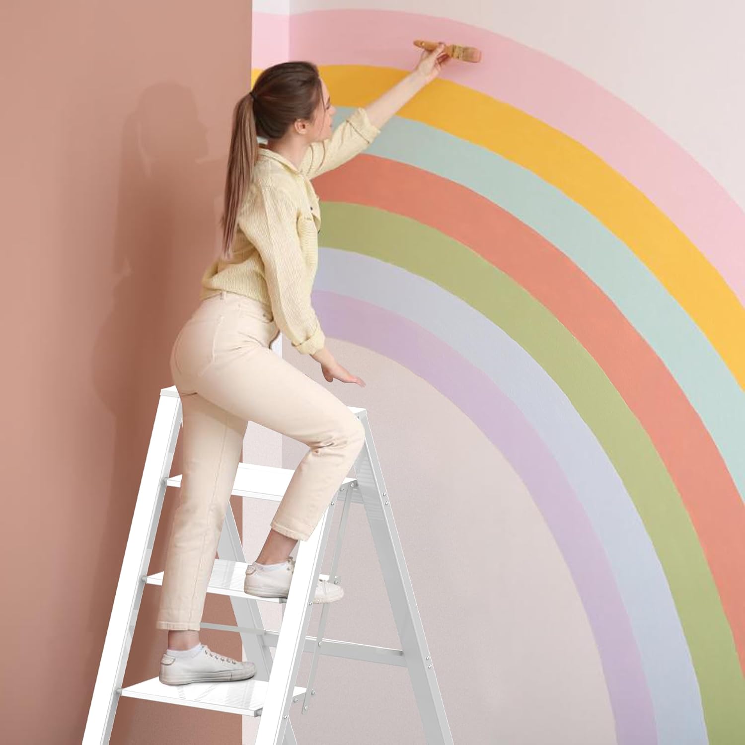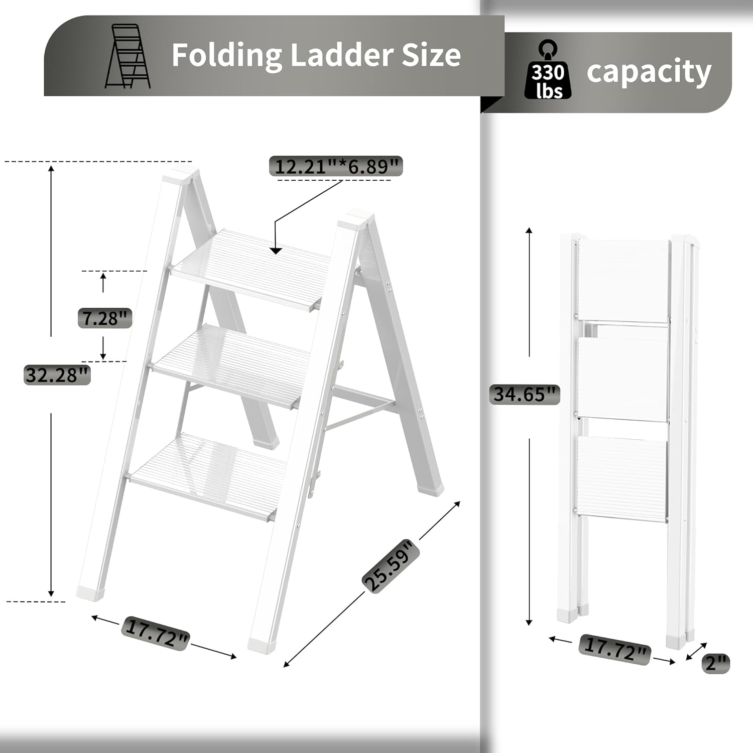 3 Step Lightweight Folding Ladder for Home, 330lbs Aluminum Step Ladder Anti-Slip for Kitchen, Step Stool Foldable Adults for Closet, 330lbs - White