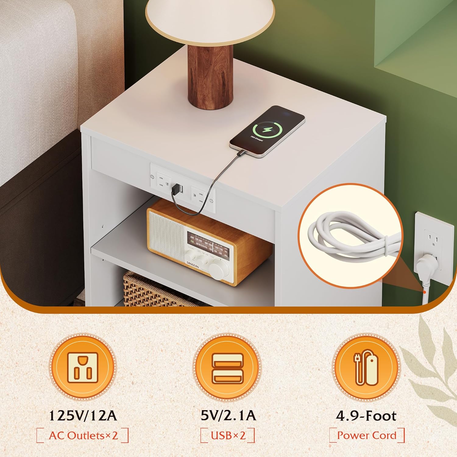 WLIVE White Nightstand, Bedside Tables, Night Stand with Charger Station, Side Table with Storage Shelf, End Table with USB Ports and Outlets for Bedroom, 15.12" D x 11.73" W x 23.74" H