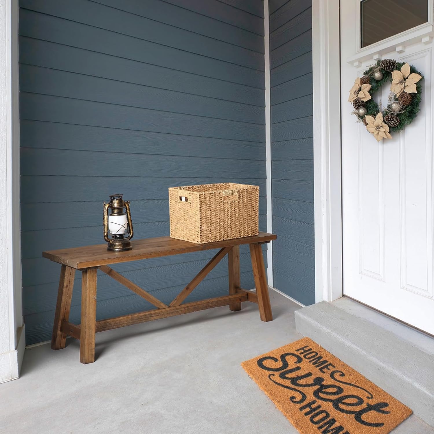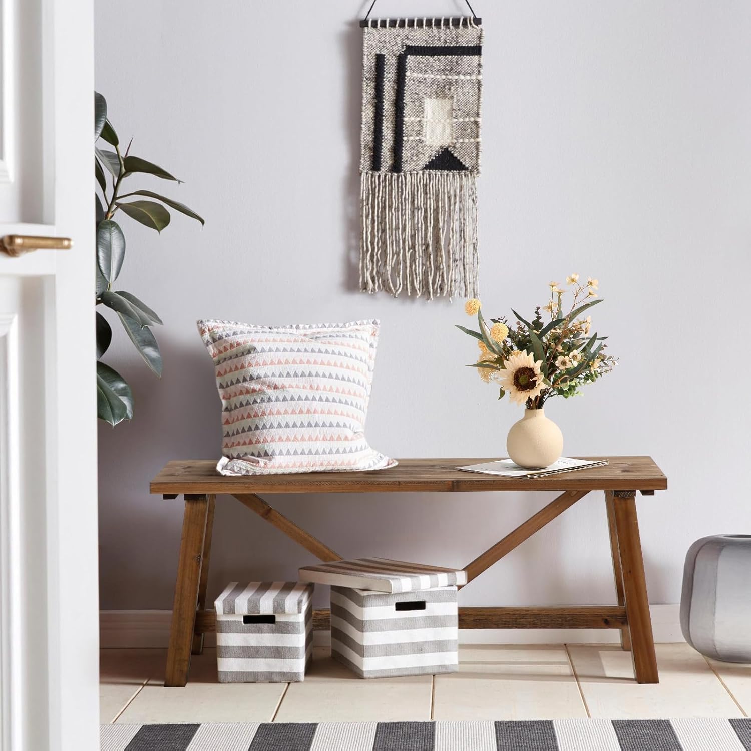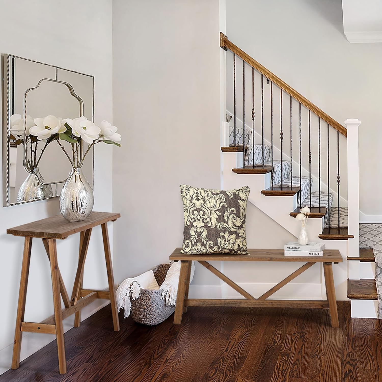 - 【Long Wood Bench】This wooden bench seat has a simple farmhouse design that can be amplified by cushion pillows and woven fabric. So take a load off and relax on this decorative bench. A small piece of furniture that make a big difference to give your home an instance refresh