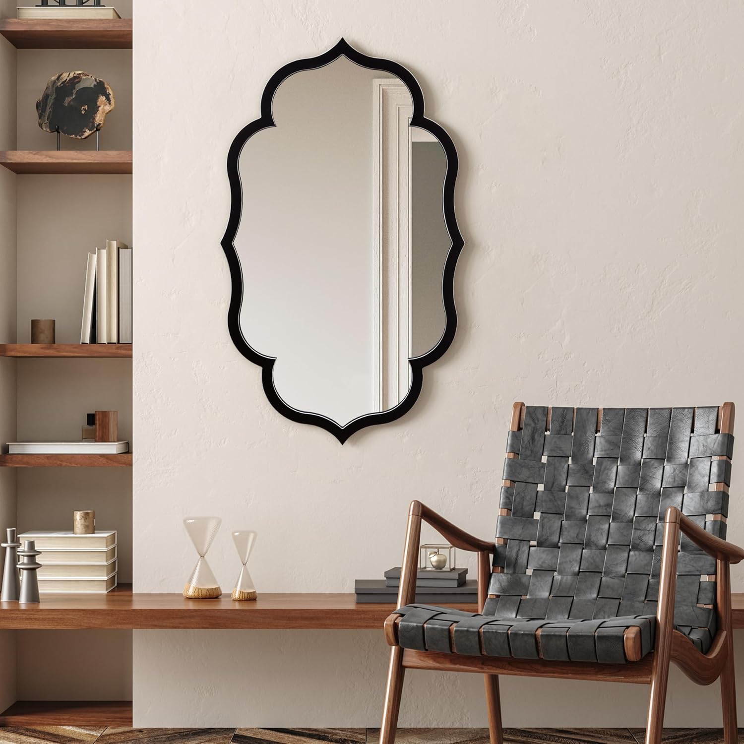 - WALL MIRROR ON BLACK MATTE FRAME- Picture a mirror, not just a reflection but a love story woven into its very frame. This generously sized mirror, measuring 40 inches by 24 inches, is a poetic symphony of classic and contemporary design. The mirror is adorned by a matte black frame and washed white edges, reminiscent of beautiful ebony, its scalloped rectangular design graced with graceful curves.