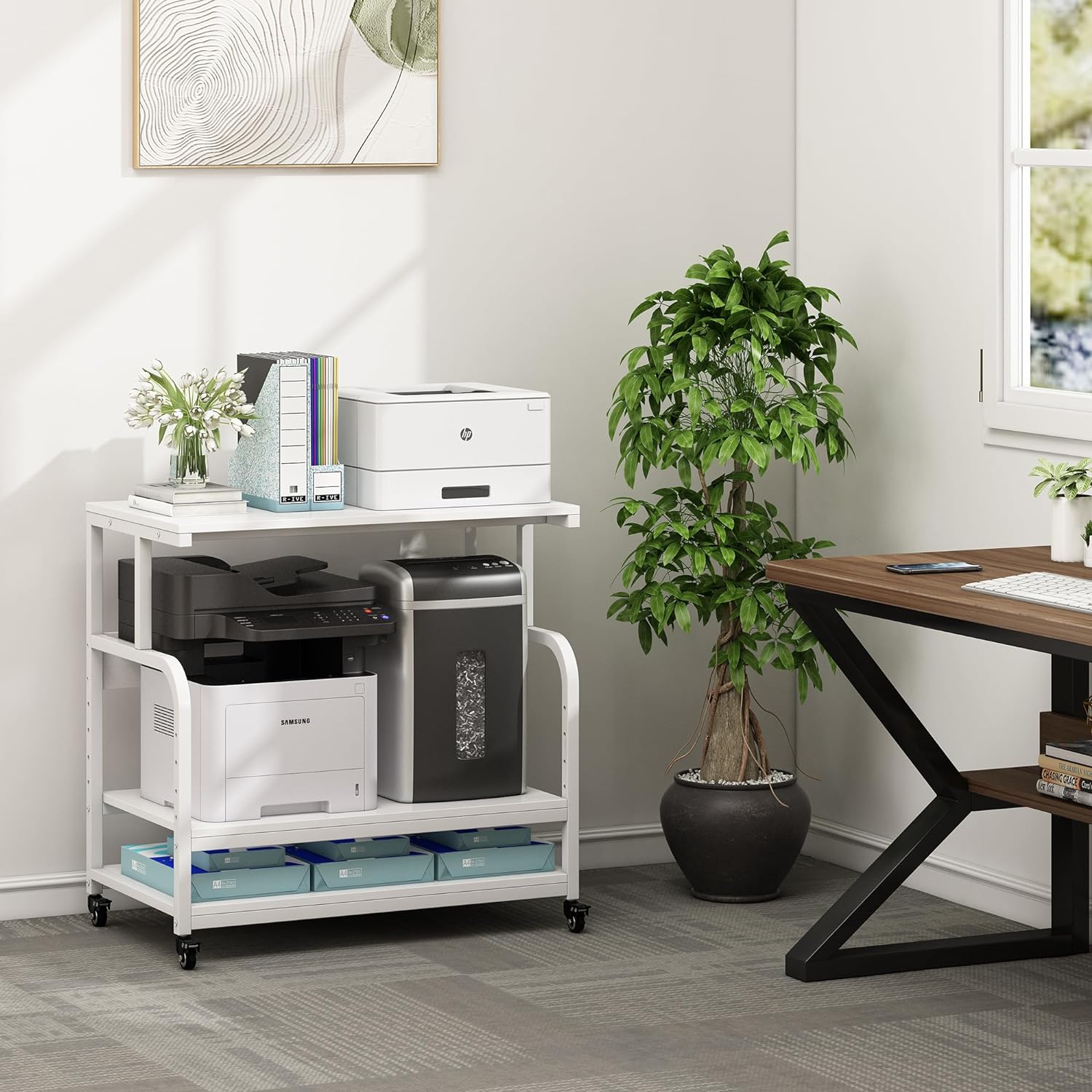 Printer Stand, 32.3" x 18.9" x 32.1" Extra Large Printer Table with Adjustable Storage Shelf, 3 Tier Rolling Printer Cart with Industrial Wheels for Home Office, White