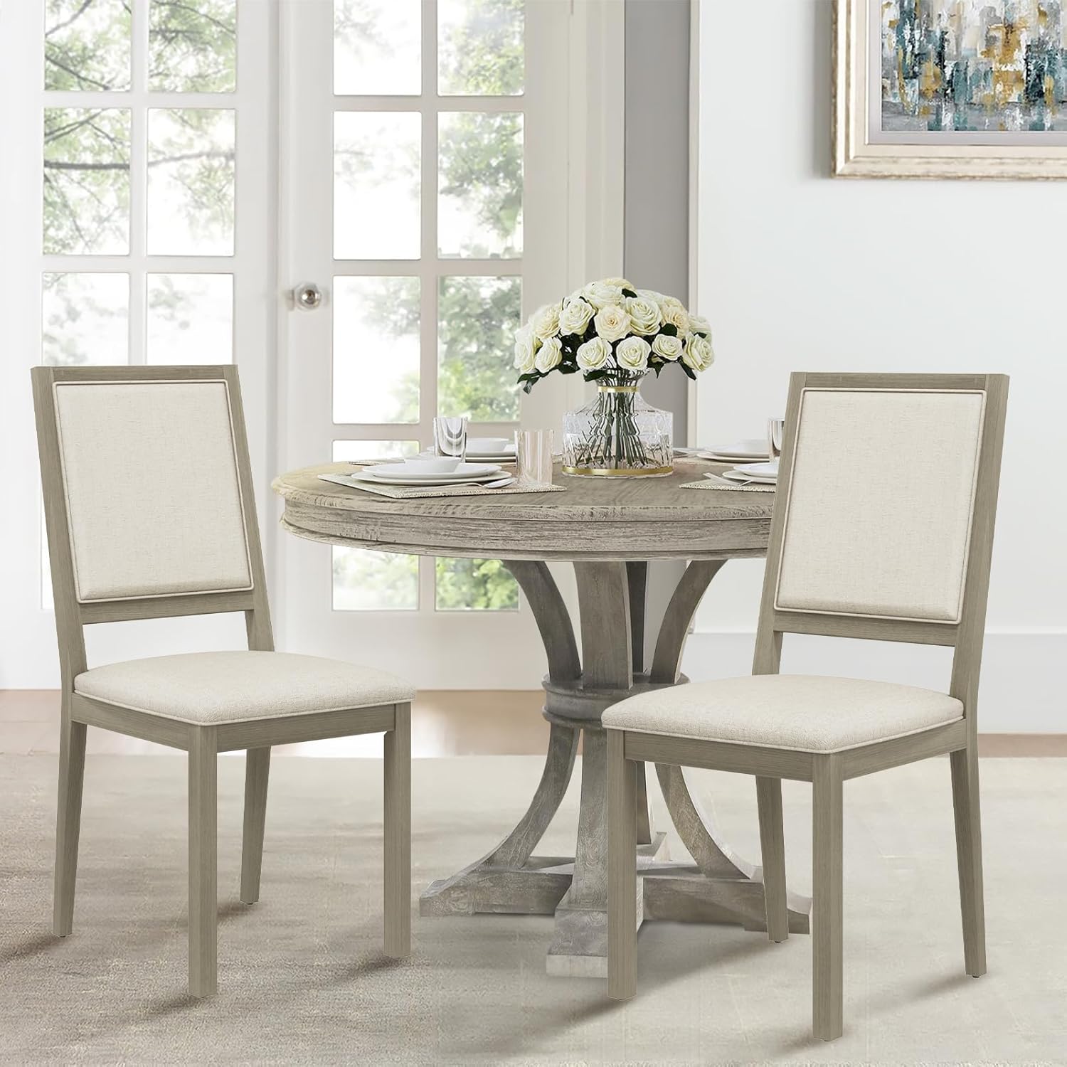 - 【Ergonomic Dining Chair】The padding and support provided by the upholstered back and cushion of wooden chair promote good posture and reduce the risk of back pain or discomfort, making them a more ergonomic choice for seating, reducing the strain and discomfort that can come from sitting in a wooden chair for extended periods of time. Comfortable dining room chair will be the great choice in any dining rooms, living rooms, witting room, office place, bistro, farm perfectly.