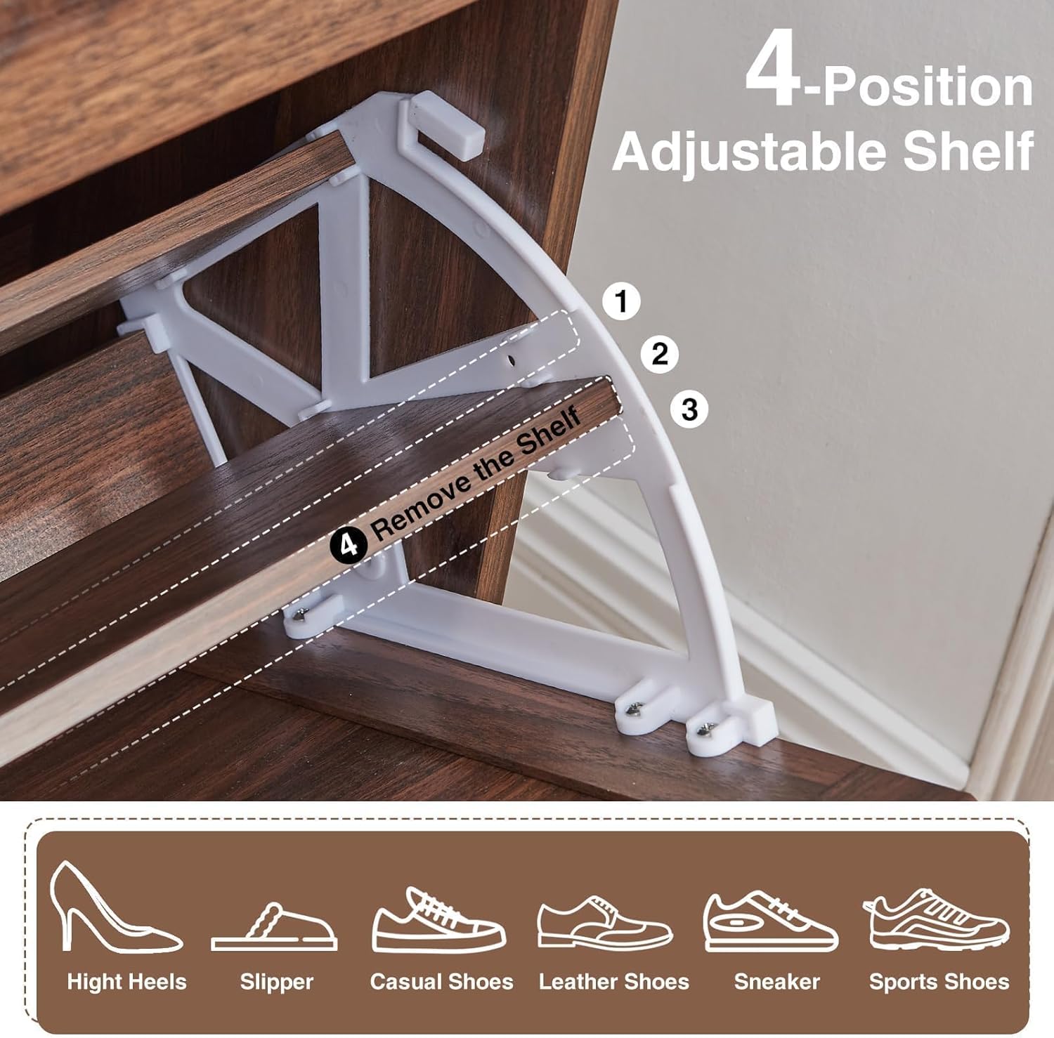 - 【Farewell to Shoe Piles】Keeps shoes handy but out of sight. Our shoe storage cabinet can accommodate a family's shoes.Four flip drawers and each with two layers. Need storage for ankle boots and high heels? You can easily adjust the space in the shoe compartments by moving or taking away the dividers