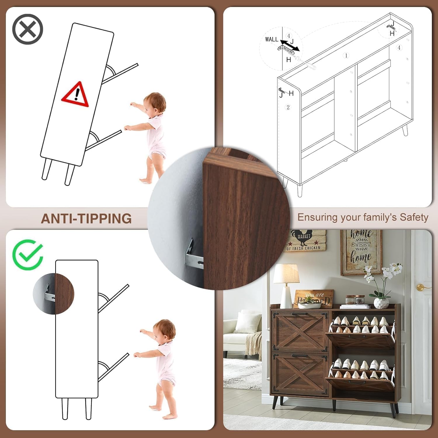 Shoe Storage Cabinet,Farmhouse Shoe Organizer with 4 Flip Drawers & Barn Door Design,Freestanding Hidden Slim Narrow Shoe Rack Cabinet for Entryway,Foyer,Hallway,Walnut