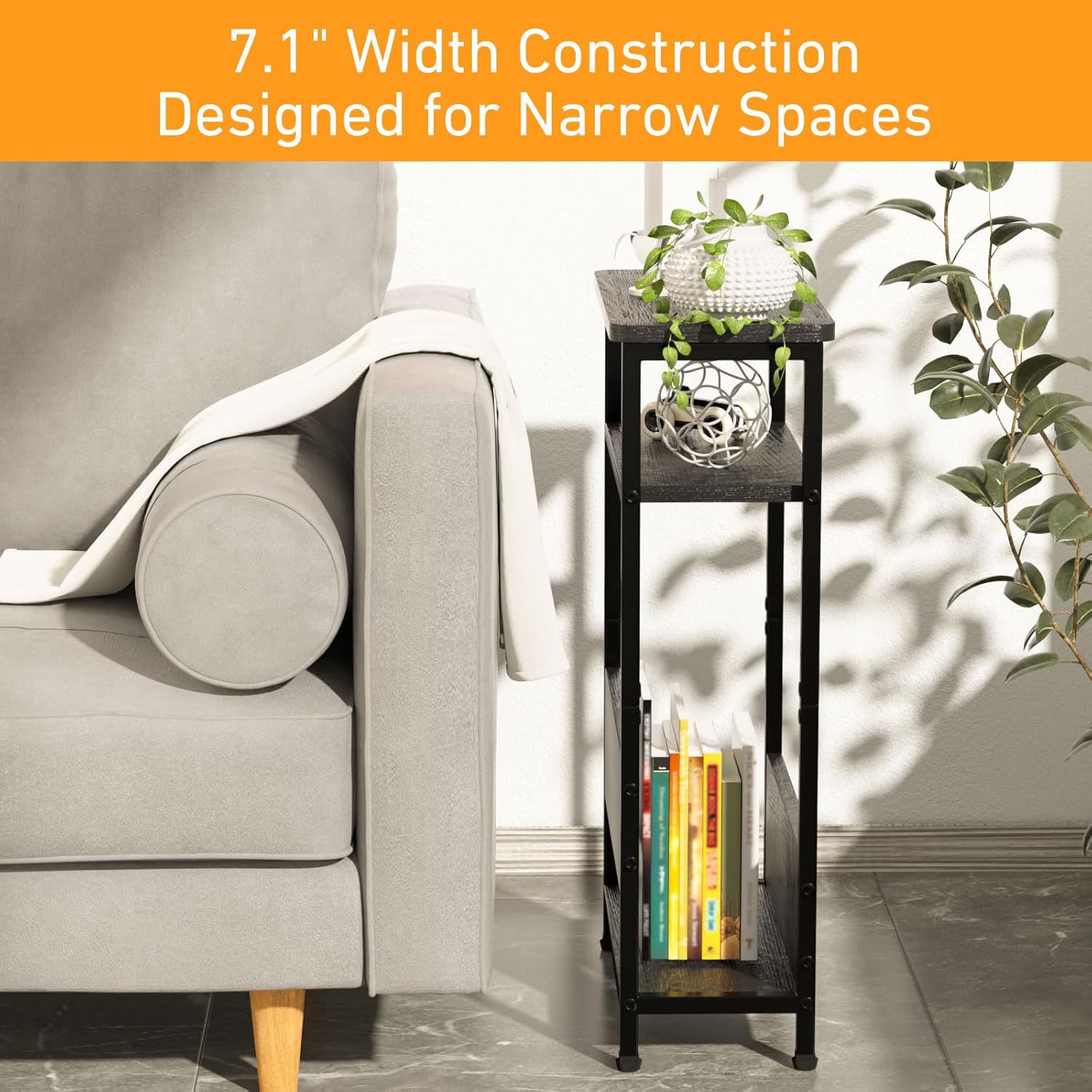 7.1" Narrow Side Table for Small Spaces, 3 Tier Small End Table with Magazine Holder, Slim/Skinny Nightstand/Bedside Table for Living Room, Bedroom, 15.4" L x 24.2" H, Black