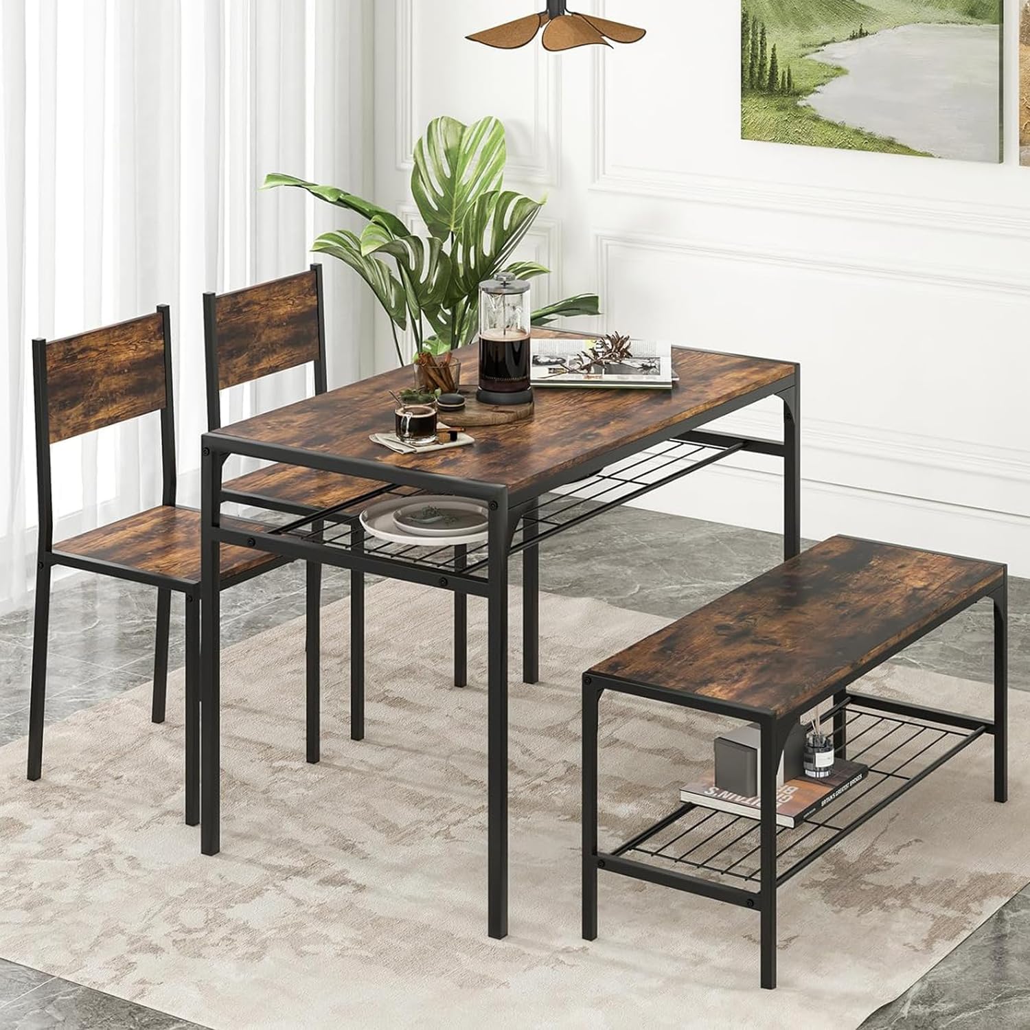 Tangkula Dining Table Set for 4, Kitchen Table and 2 Chairs for 4 with Bench, Additonal Storage Rack, 4 Piece Dining Table Set for Small Space, Apartment