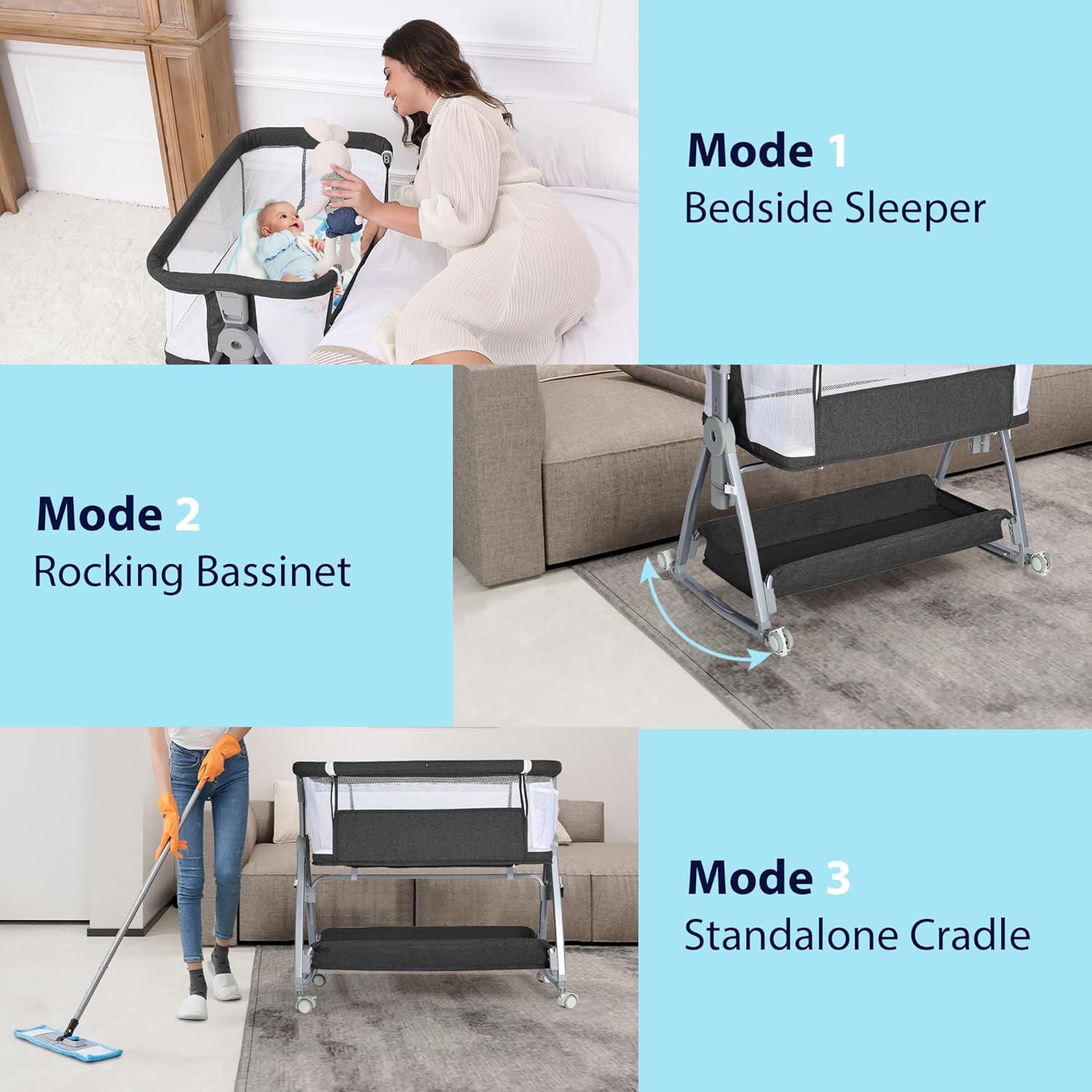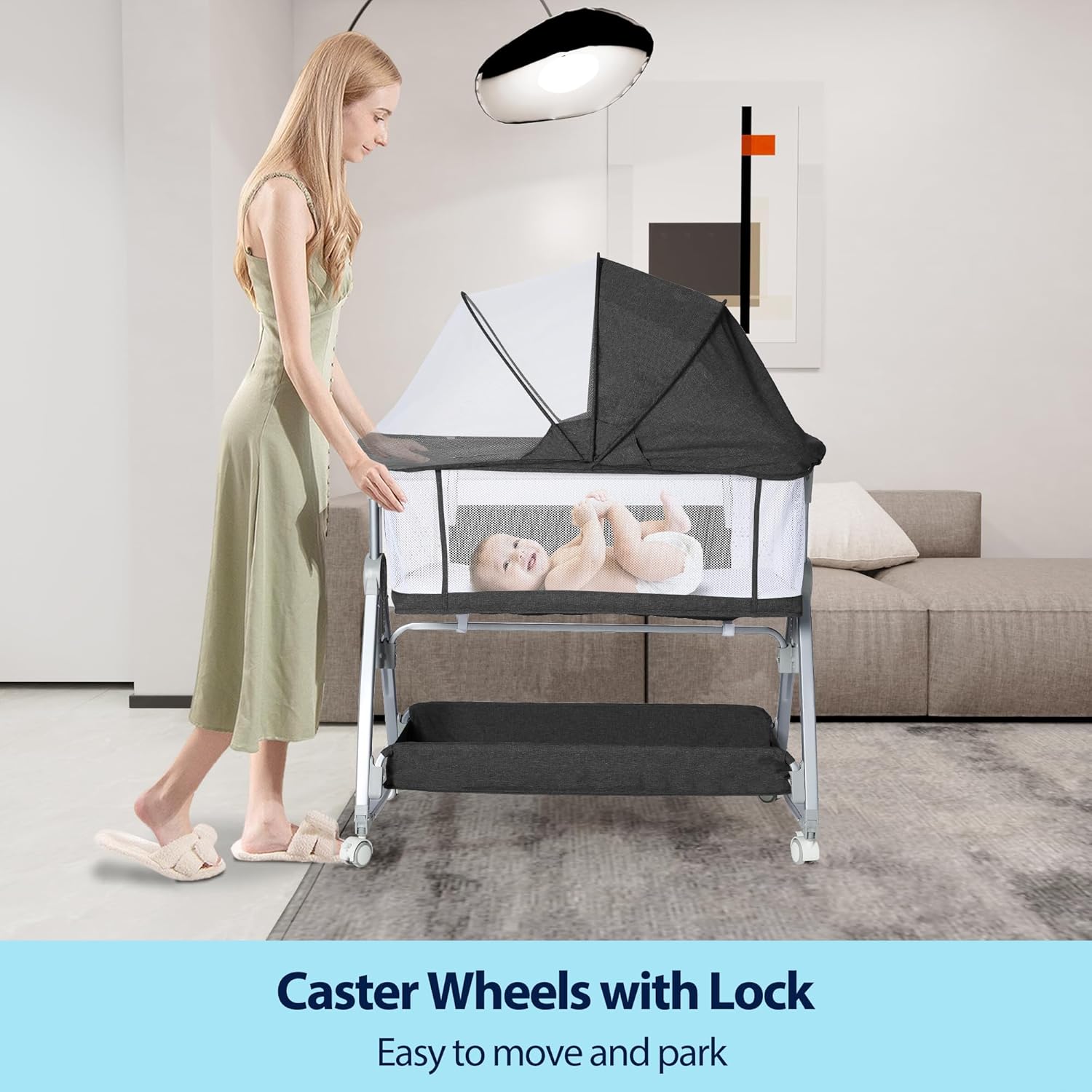 Baby Bassinet Bedside Sleeper, 3 in 1 Rocking Bassinet for Baby, Arms Reach Co Sleeper Bassinet with Wheels, Adjustable Height, Storage, Mattress & Canopy (Black)