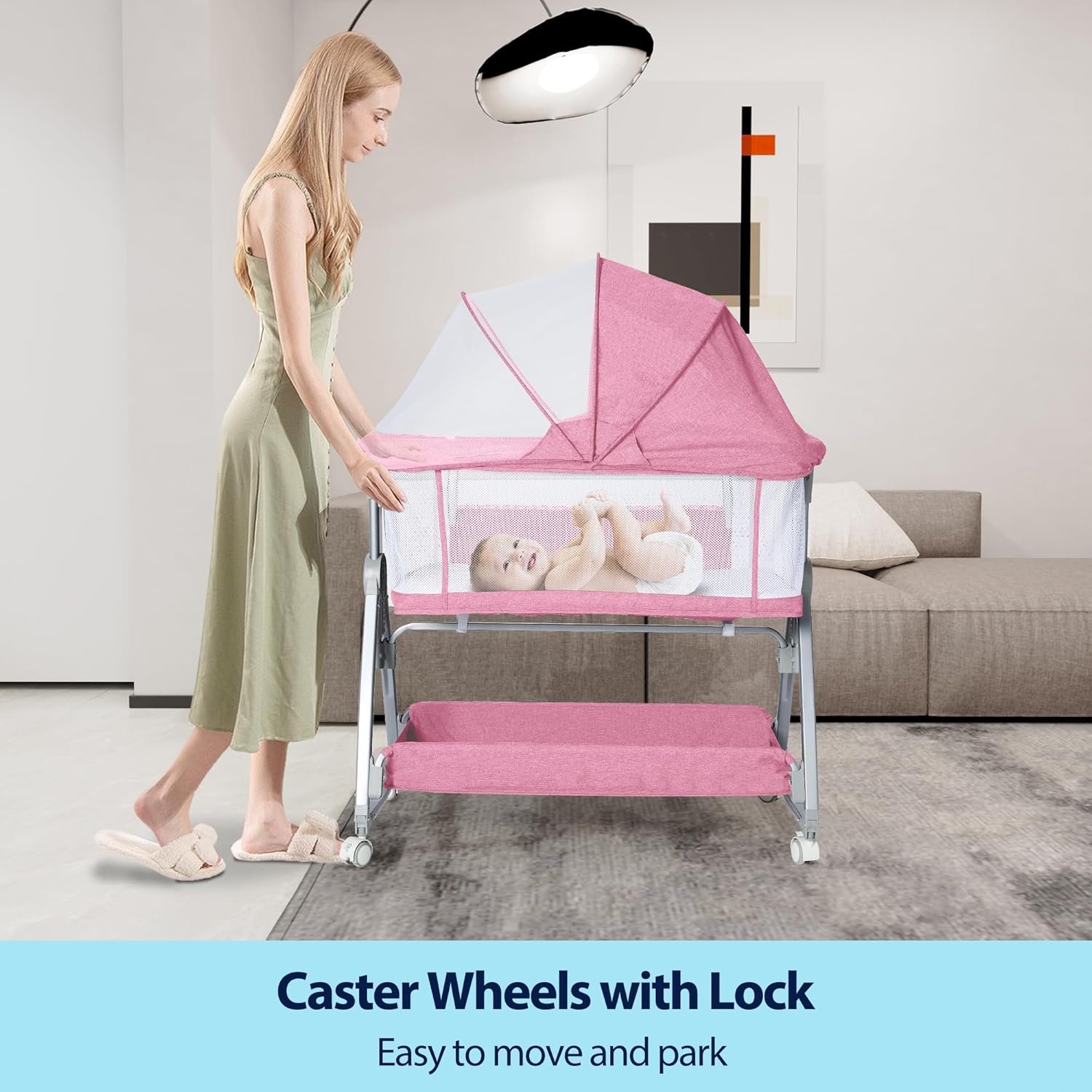 Baby Bassinet Bedside Sleeper, 3 in 1 Rocking Bassinet for Baby, Arms Reach Co Sleeper Bassinet with Wheels, Adjustable Height, Storage, Mattress & Canopy (Pink)