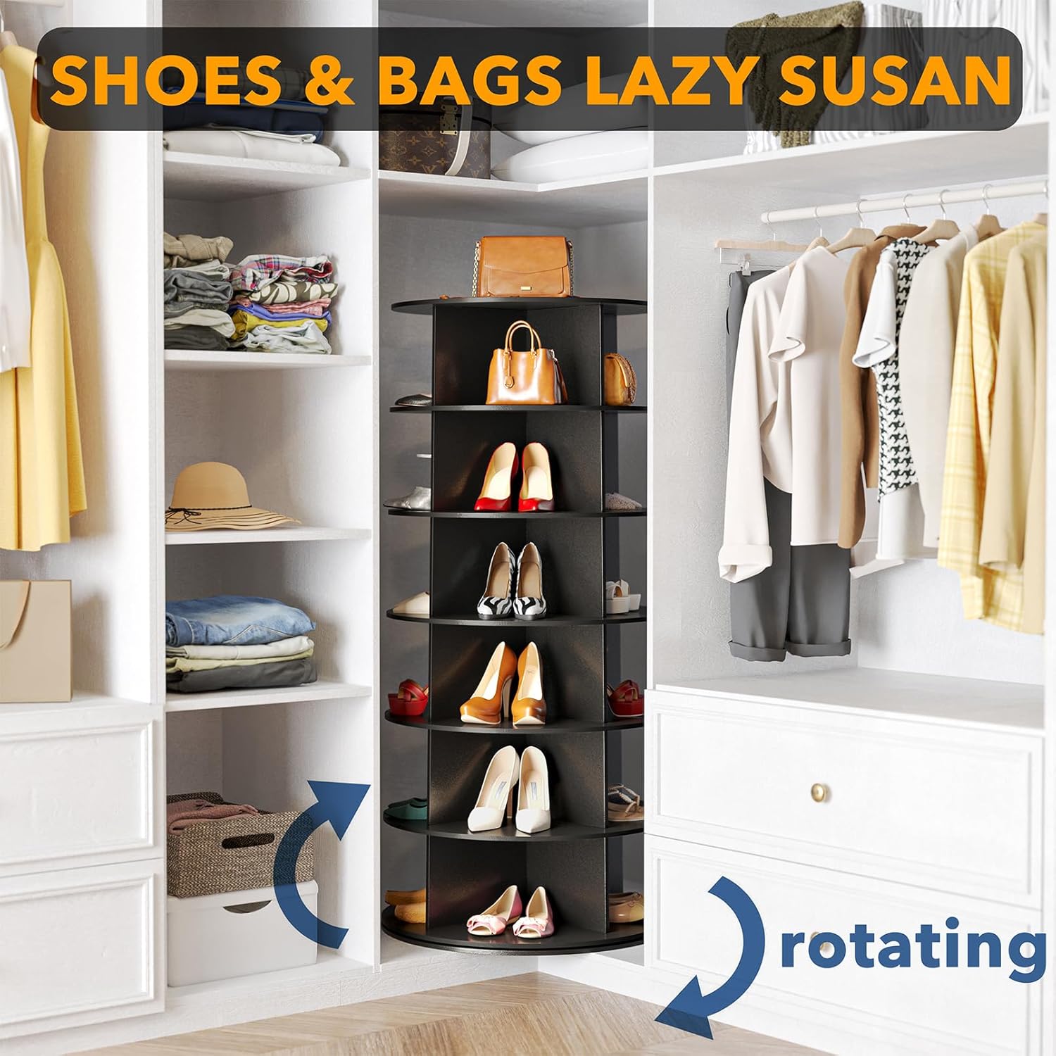 - ORGANIZED AND BEAUTIFUL - Make your shoes neat and organized with this rotating shoe rack tower lazy susan; The space saving design can hold up many shoes or bags in a compact space; SIZE: 23.2"W x 23.2"D x 54.2"H