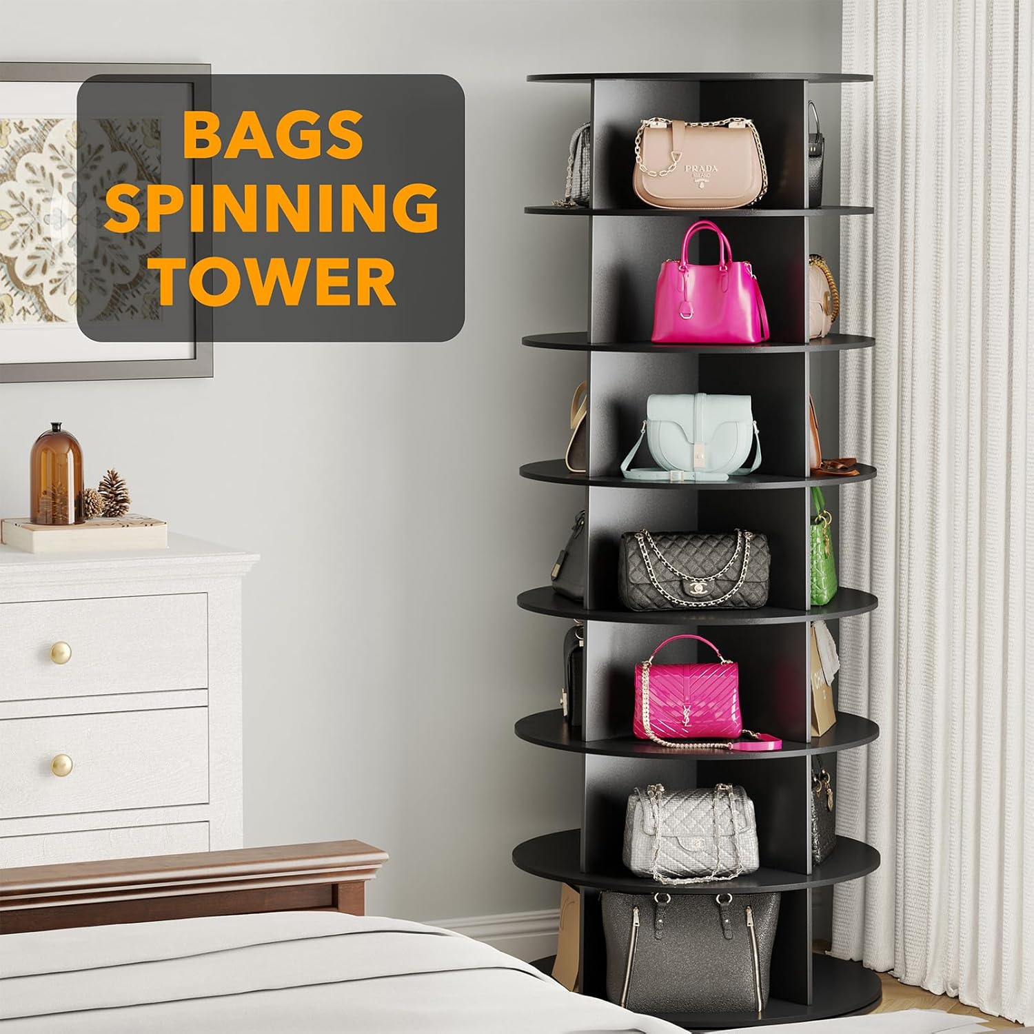 - ORGANIZED AND BEAUTIFUL - Make your shoes neat and organized with this rotating shoe rack tower lazy susan; The space saving design can hold up many shoes or bags in a compact space; SIZE: 23.2"W x 23.2"D x 63"H