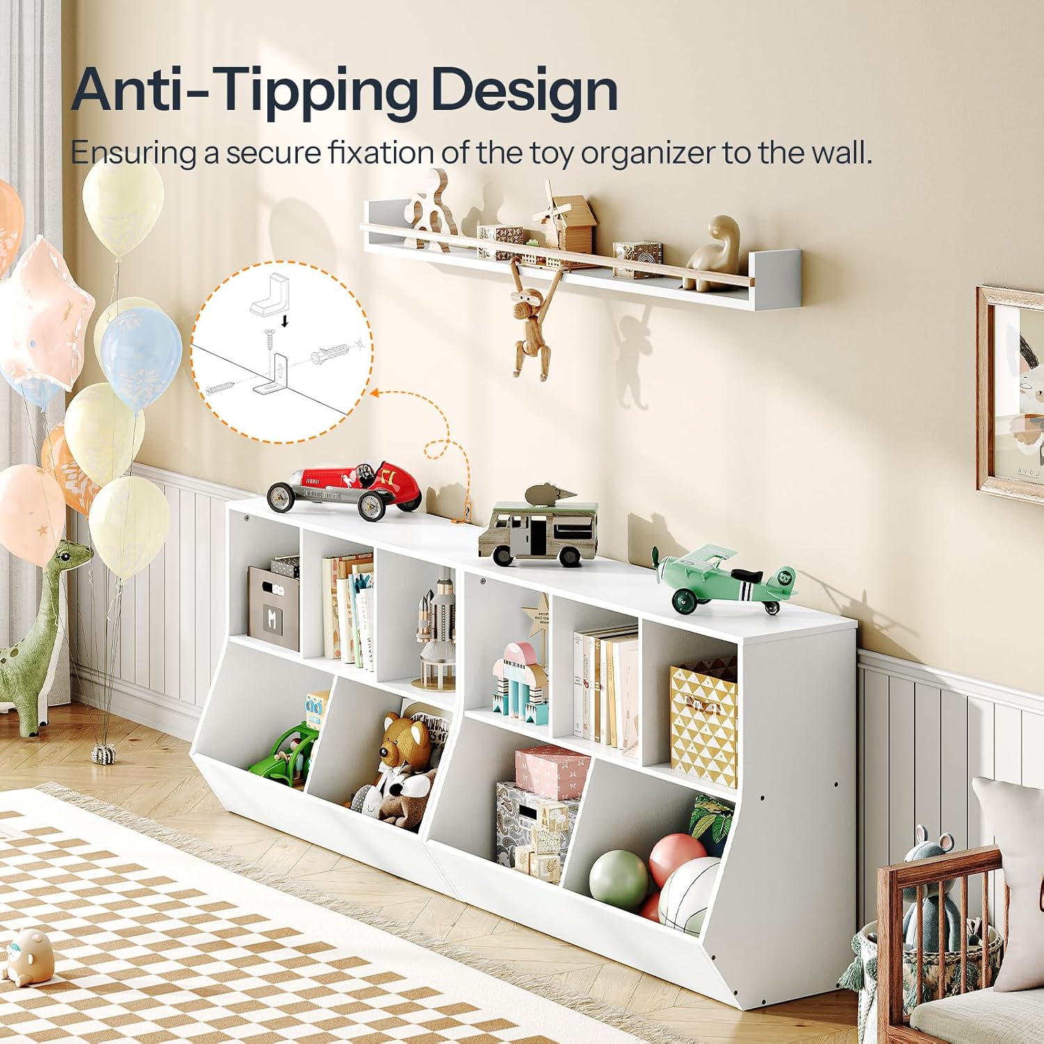 - Thoughtful Details: The widened vertical base not only expands the storage space, but also enhances the overall stability. With the anti-tip device, the toy storage organizer remains upright and stable. Four EVA non-slip pads on the bottom prevent scratching the floor