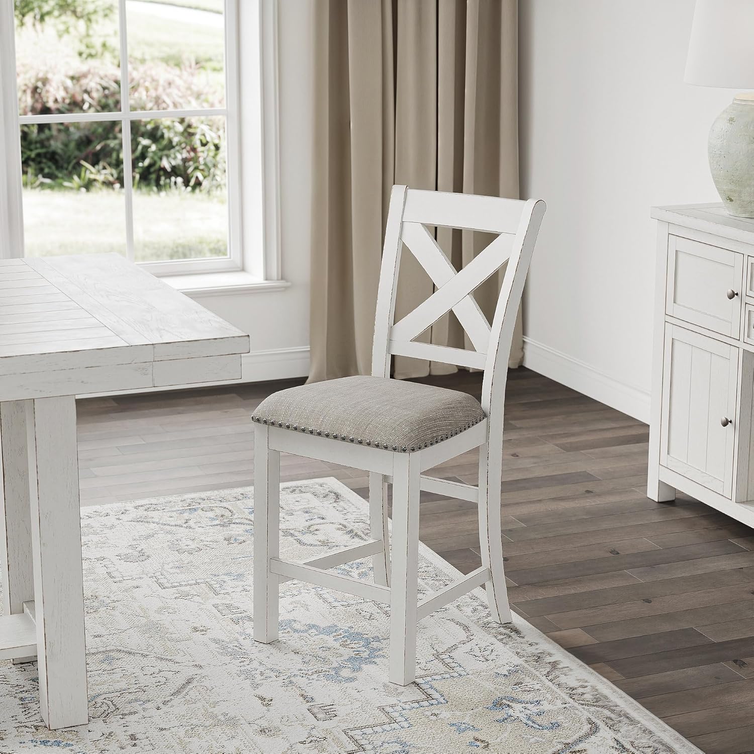 - BEAUTIFULLY CRAFTED: Made with wood. Antiqued white finish with wood grain texture. Foam cushioned seat covered in easy-care polyester upholstery. Nailhead trim. X-back design