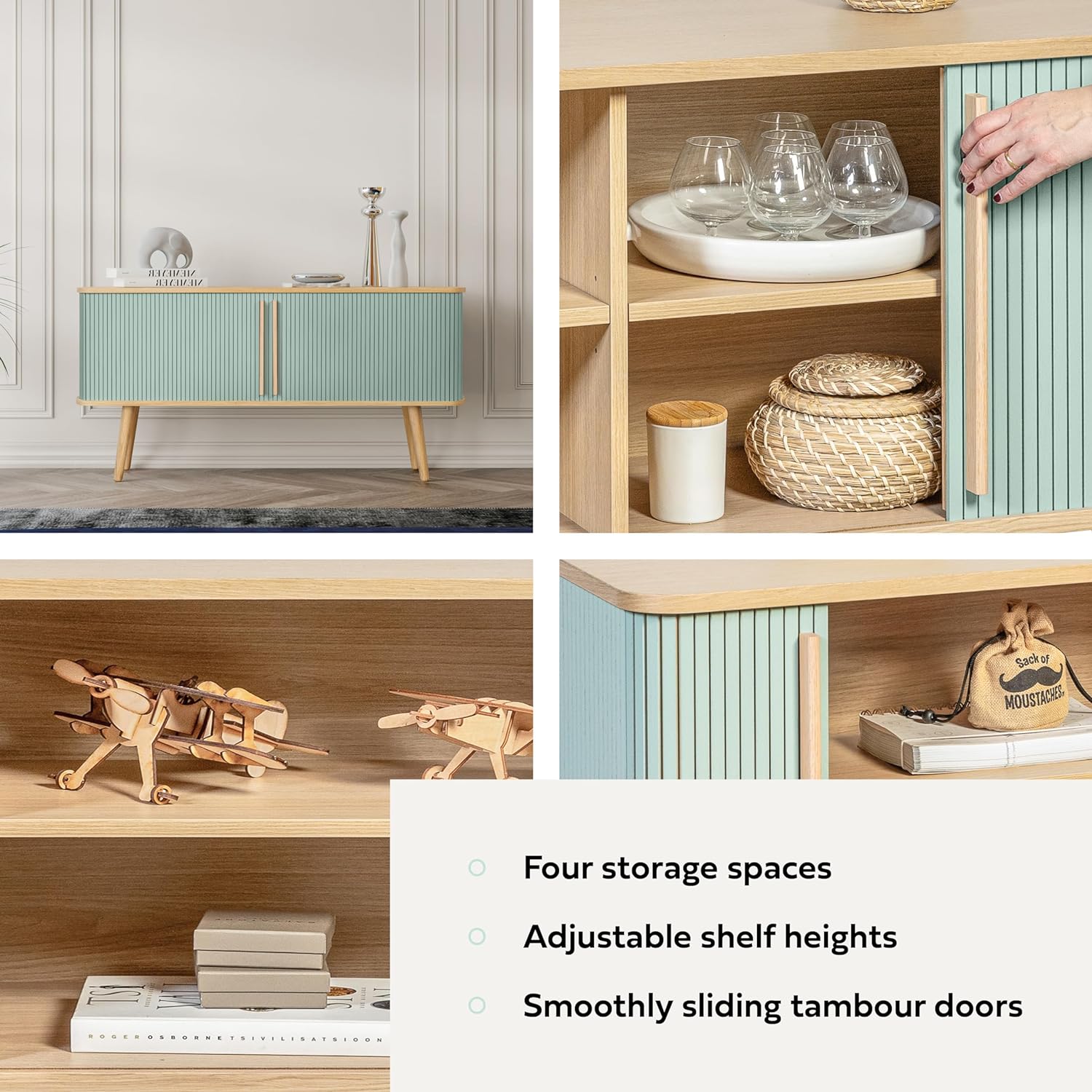 - BRING CHARACTER TO YOUR HOME as this sideboard with smoothly sliding blue tambour doors is designed to serve as a focal point in your space, reflecting your personality and style. Aesthetic appeal makes it suitable for kitchen, dining room, living room, entryway, office and kids room.