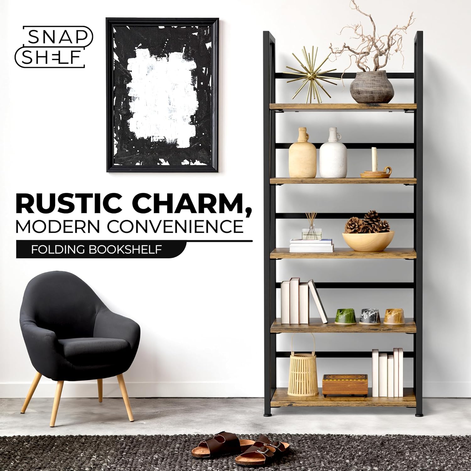 - BRING RUSTIC ELEGANCE to your living space with our collapsible bookshelf. It's the perfect addition to your office or living room, offering both function and beauty. This wood bookshelf draws the eye, creating a focal point that fills the room with warmth