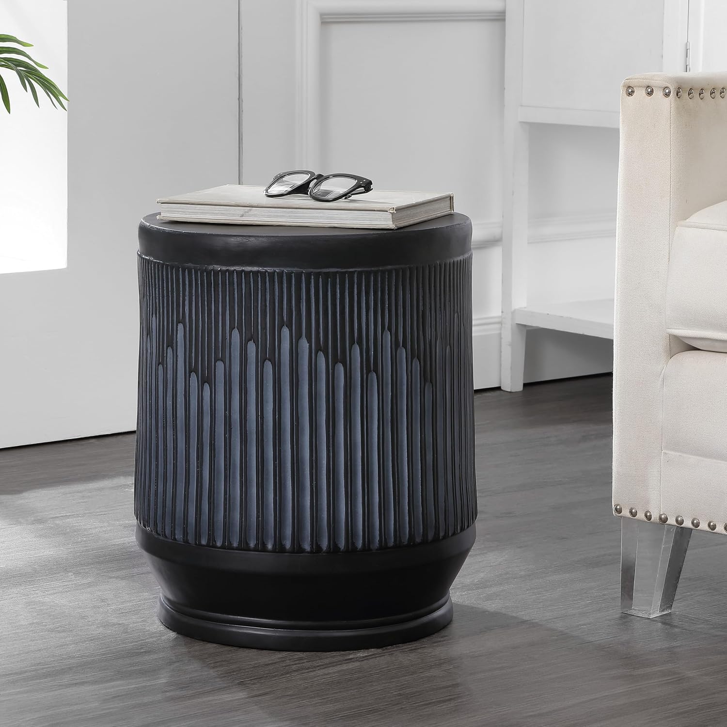 - A smooth, matte black finish washed in white accentuates the brutalist, mid-century look of this accent table