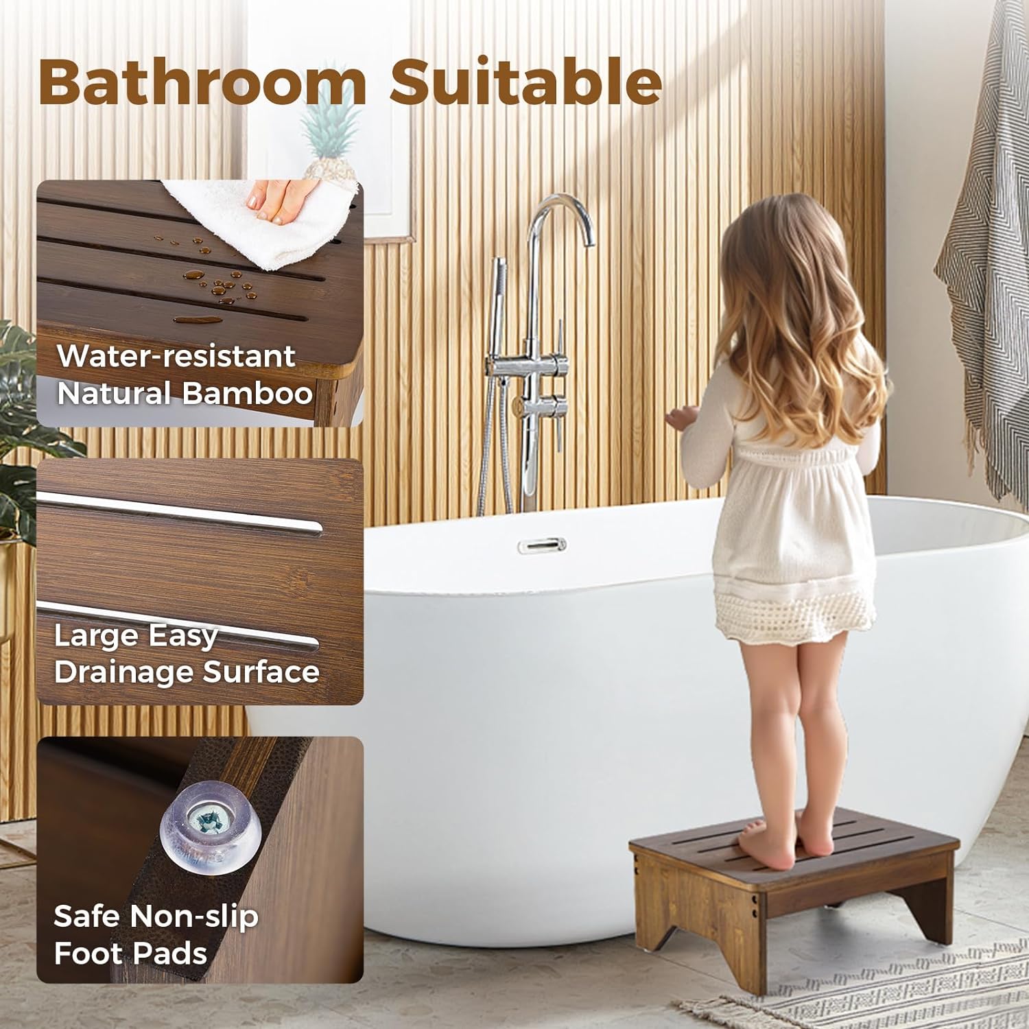 - Bathroom & Bedroom Safety Features – With a water-resistant bamboo surface, drainage slots, and anti-slip foot pads, this stool prevents slipping on wet bathroom tiles or hardwood floors. Use it confidently as a senior shower step, bedside step stool, or safe helper stool for children in kitchens and bathrooms.