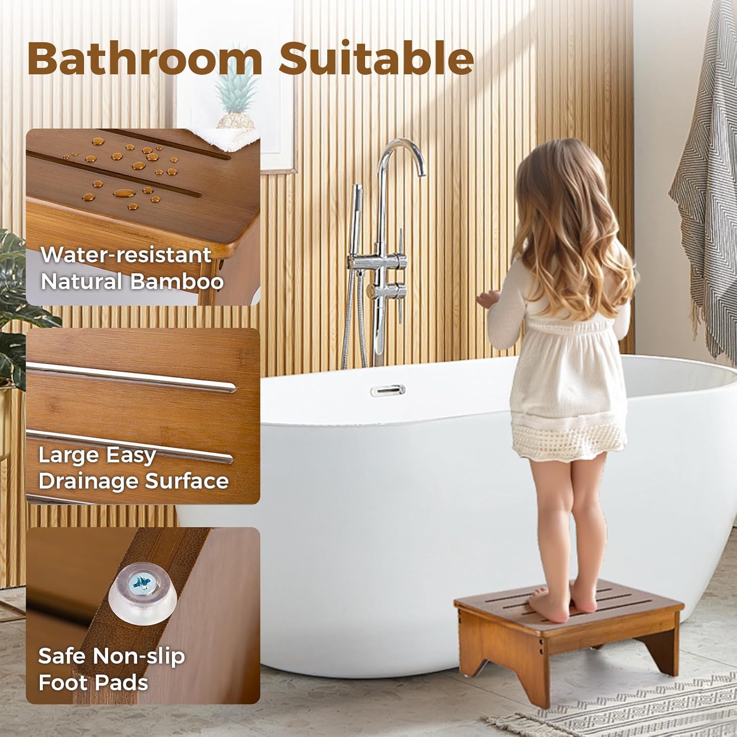- Perfect Step Aid for Seniors & Kids – This 6.5-inch high bamboo step stool is an excellent choice as an elderly step stool or kids bathroom stool, making it safer to climb into bed, reach sinks, or step into the shower. Rounded edges and a sturdy build give extra peace of mind for families with children and aging parents.